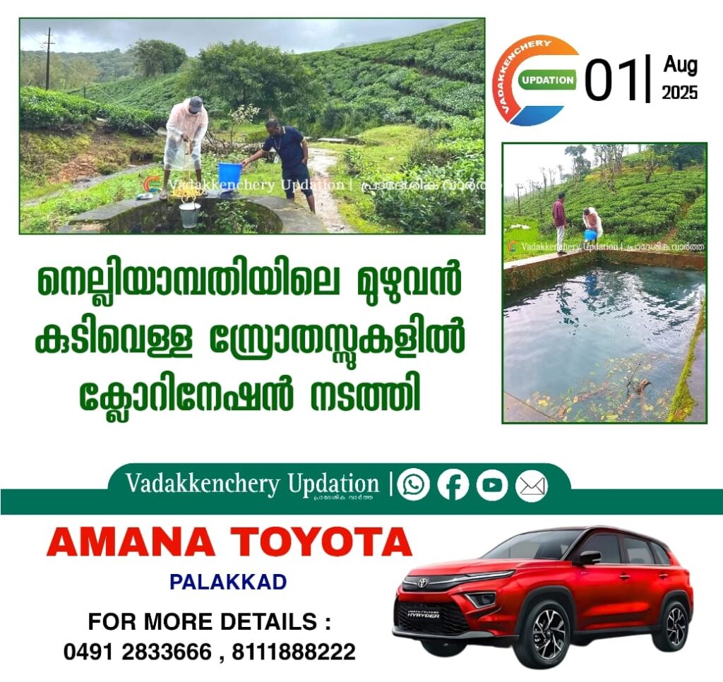 മഴക്കാല രോഗ പ്രതിരോധ പ്രവര്ത്തനത്തിന്റെ ഭാഗമായി നെല്ലിയാമ്പതിയിലെ മുഴുവന് കുടിവെള്ള സ്രോതസ്സുകളിലും ക്ലോറിനേഷന് നടത്തി. നെല്ലിയാമ്പതിയിലെ പാടഗിരി, തൊട്ടേക്കാട്, രാജാക്കാട്, പുല്ലാല, ഓറിയന്റല്, ലിലി, നൂറടി ,പോത്തുപാറ, മീരഫ്ലോറ, കൂനംപാലം, ഏലം സ്റ്റോര്, തേനിപാടി, കൈകാട്ടി, ഓറഞ്ച് ഫാം, പുലയംപാറ, ഊത്ത്ക്കുഴി, സീതാര്കുണ്ട്, കോട്ടയങ്ങാട്, ചന്ദ്രാമല എന്നീ പ്രദേശങ്ങളിലെ കുടിവെള്ള സ്രോതസ്സുകളിലാണ് ക്ലോറിനേഷന് നടത്തിയത്. ഹെല്ത്ത് ഇന്സ്പെക്ടര് ജെ ആരോഗ്യം ജോയ്സണ്, ജൂനിയര് ഹെല്ത്ത് ഇന്സ്പെക്ടര്മാരായ ബി അഫ്സല്, എസ് ശരണ്റാം, വോളന്റീയര്മാരായ മണികണ്ഠന് പുല്ലുകാട്, പ്രതീപ് രാജാക്കാട് എന്നിവരുടെ നേതൃത്വത്തിലാണ് ക്ലോറിനേഷന് നടത്തിയത്.
