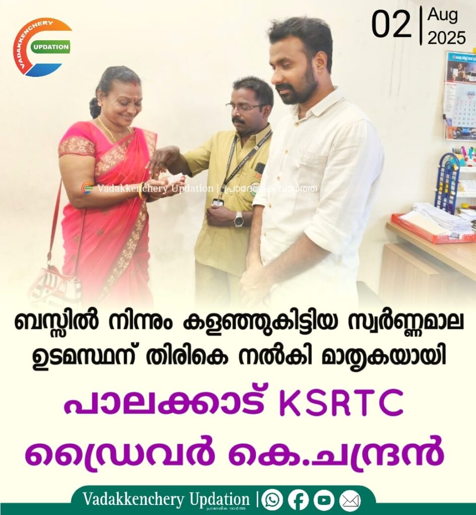 ബസ്സിൽ യാത്രക്കാരൻ നഷ്ടപ്പെടുത്തി കളഞ്ഞ 4 പവൻ്റെ സ്വർണ്ണമാല കണ്ടെടുത്ത് ഉടമസ്ഥന് തിരികെ നൽകി മനുഷ്യത്വത്തിന്റെ പ്രതീകമായി മാറുകയാണ് പാലക്കാട് KSRTC ഡിപ്പോയിലെ മുതിർന്ന ഡ്രൈവർ കെ. ചന്ദ്രൻ നെന്മാറ കരിമ്പാറയിൽ ആണ് വീട്. പാലക്കാട്-പൊള്ളാച്ചി റൂട്ടിൽ സർവീസ് നടത്തിയിരുന്ന ബസിന്റെ യാത്ര അവസാനിച്ച് ഡ്രൈവർയും കണ്ടക്ടറും ബസ്സ് പരിശോധിക്കുമ്പോഴാണ് സീറ്റിന് സമീപം ഒരു പൊതിയിൽ സ്വർണ്ണമാല കണ്ടത്. ഉടൻ തന്നെ അവർ അത് ബസ് ഡിപ്പോയിലെ മുതിർന്ന ഉദ്യോഗസ്ഥരോട് ഏൽപ്പിച്ചു. പിന്നാലെ നടത്തിയ അന്വേഷണത്തിലാണ് ഒരു സ്ത്രീ ബസ്സിൽനിന്ന് സ്വർണ്ണമാല നഷ്ടപ്പെട്ടതായി പരാതി നൽകിയിരുന്നതും