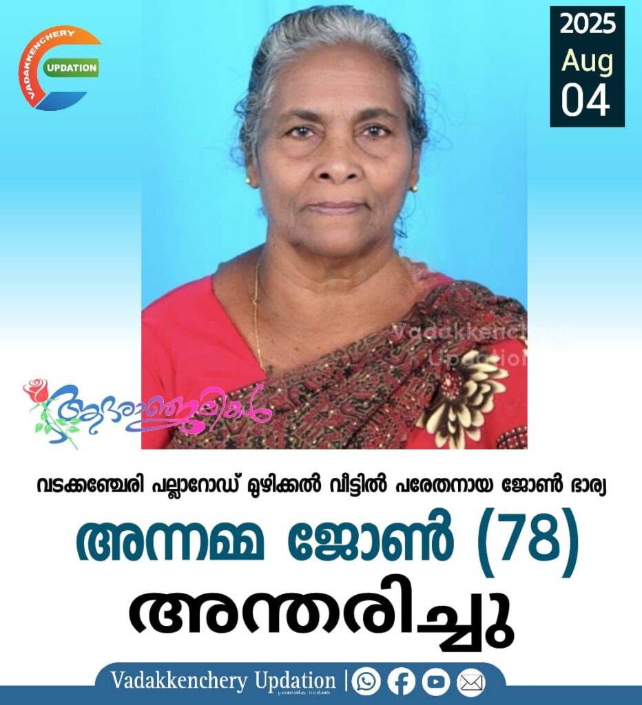 വടക്കഞ്ചേരി പല്ലാറോഡ് മുഴിക്കൽ വീട്ടിൽ പരേതനായ ജോൺ ഭാര്യ അന്നമ്മ ജോൺ (78) അന്തരിച്ചു .സംസ്കാരം ഇന്ന് (04.08.2025 -തിങ്കൾ) രാവിലെ 10:30 ന് ചക്കുണ്ട് സെൻ്റ് ജോർജ് മലങ്കര കത്തോലിക്കാ പള്ളിയിൽ. മക്കൾ: രാജു, മോളി, പരേതനായ സജി. മരുമക്കൾ: ഓമന, ജയിംസ്, അനിത