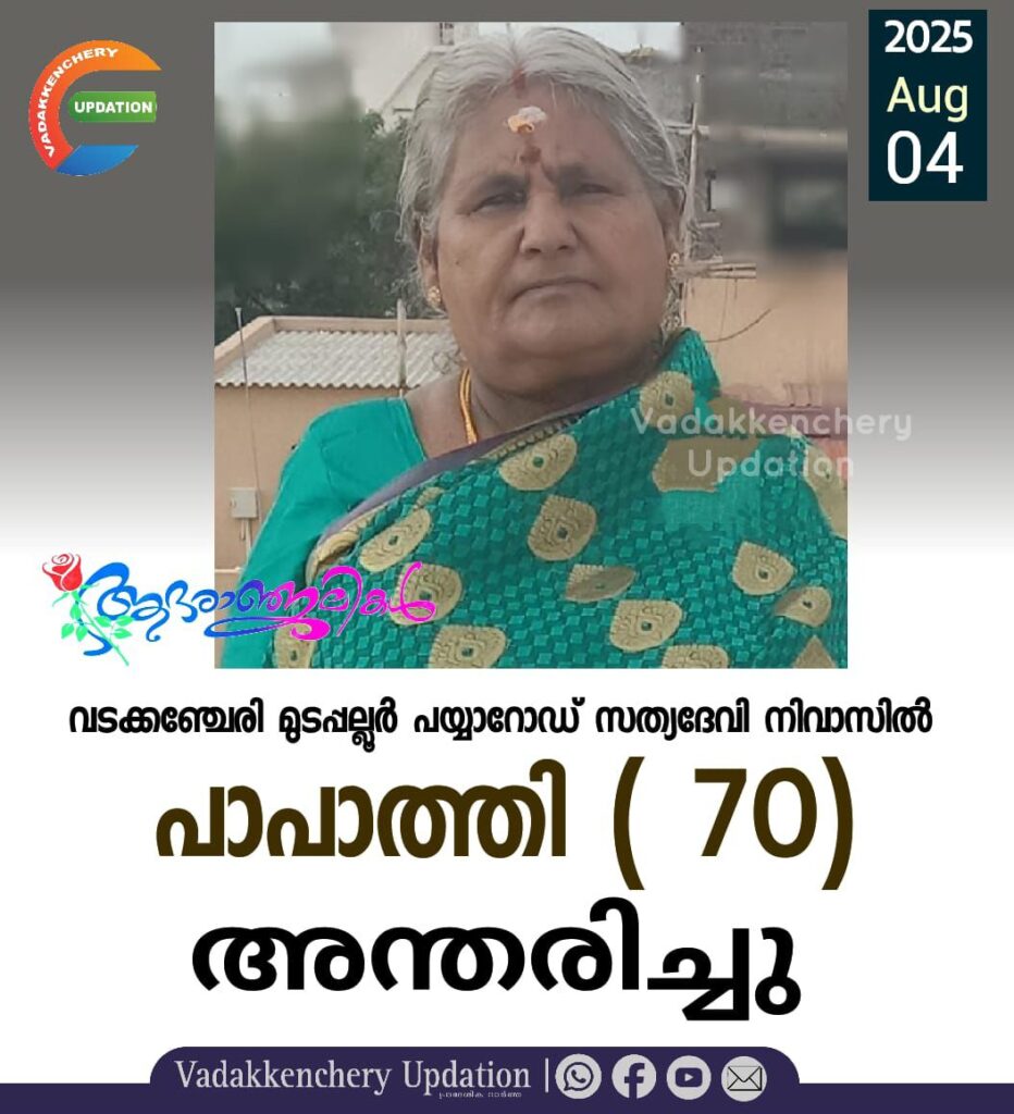 വടക്കഞ്ചേരി മുടപ്പല്ലൂർ പയ്യാറോഡ് സത്യദേവി നിവാസിൽ പാപാത്തി ( 70) അന്തരിച്ചു