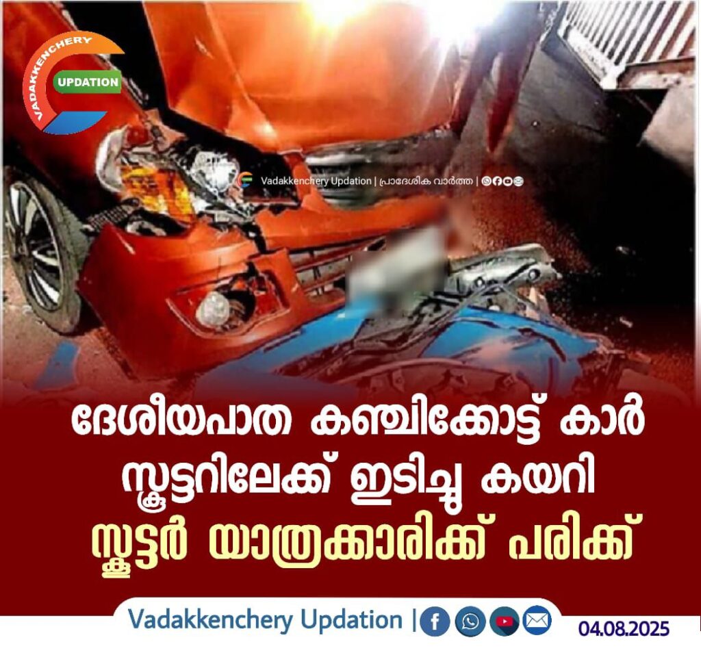 ദേശീയപാത കഞ്ചിക്കോട്ട് കാർ സ്കൂട്ടറിലേക്ക് ഇടിച്ചു കയറി സ്കൂട്ടർ യാത്രക്കാരിക്ക് പരിക്ക്