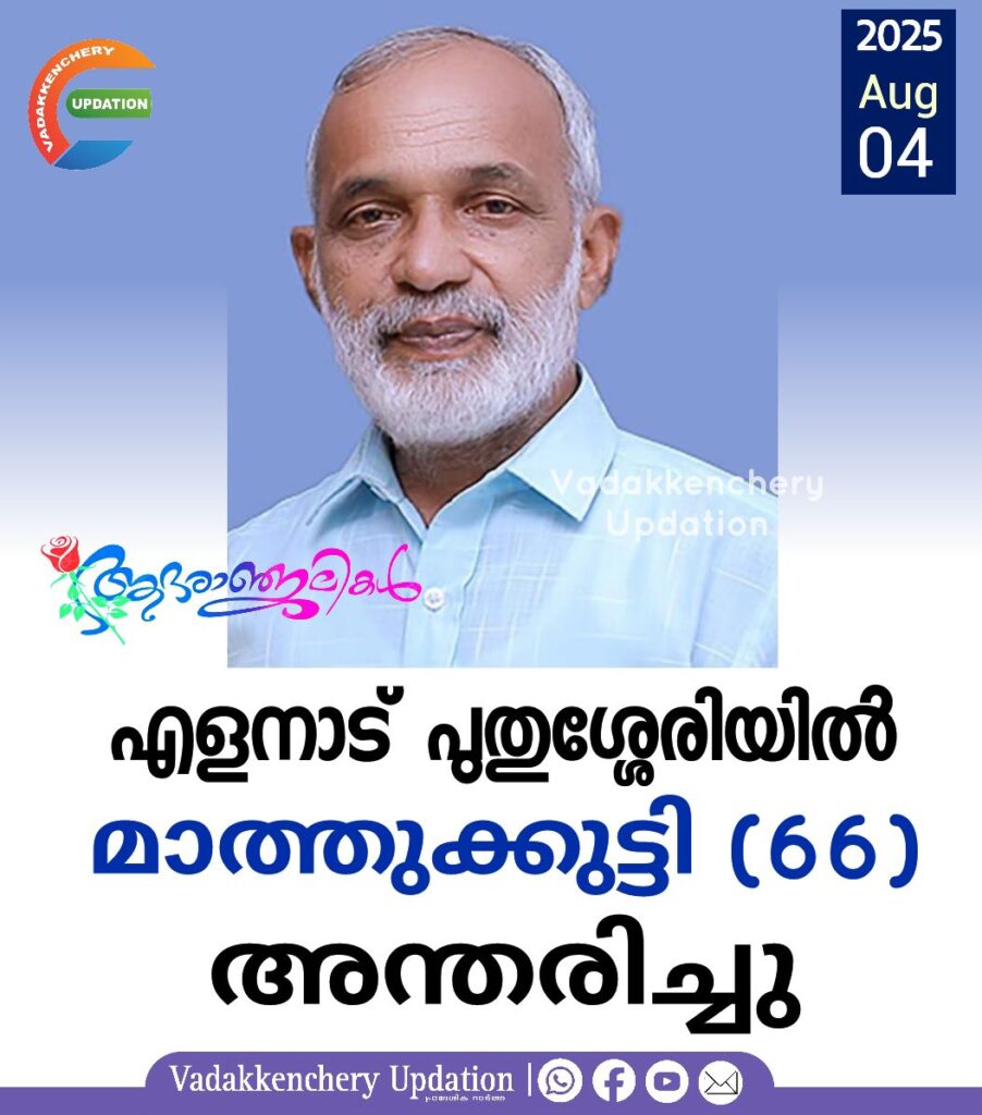 എളനാട് പുതുശ്ശേരിയിൽ സ്കറിയ മകൻ മാത്തുക്കുട്ടി (66) അന്തരിച്ചു. ഭൗതിക ശരീരം ഇന്ന് (തിങ്കളാഴ്ച) വൈകീട്ട് 4 ന് സ്വവസതിയിൽ എത്തിച്ചേരുകയും, സംസ്കാരം നാളെ (05.08.2025- ചൊവ്വാഴ്ച) ഉച്ചയ്ക്ക് 12:00 ന് ചുവന്നമണ്ണ് സെൻ്റ് ജോർജ് യാക്കോബായ സുറിയാനി പള്ളിയിൽ. ഭാര്യ: ഡെയ്സി. മക്കൾ: ഡെയ്നി(UK),ബേസിൽ(UK)മരുമകൻ: ജിമിൻസ്(UK)