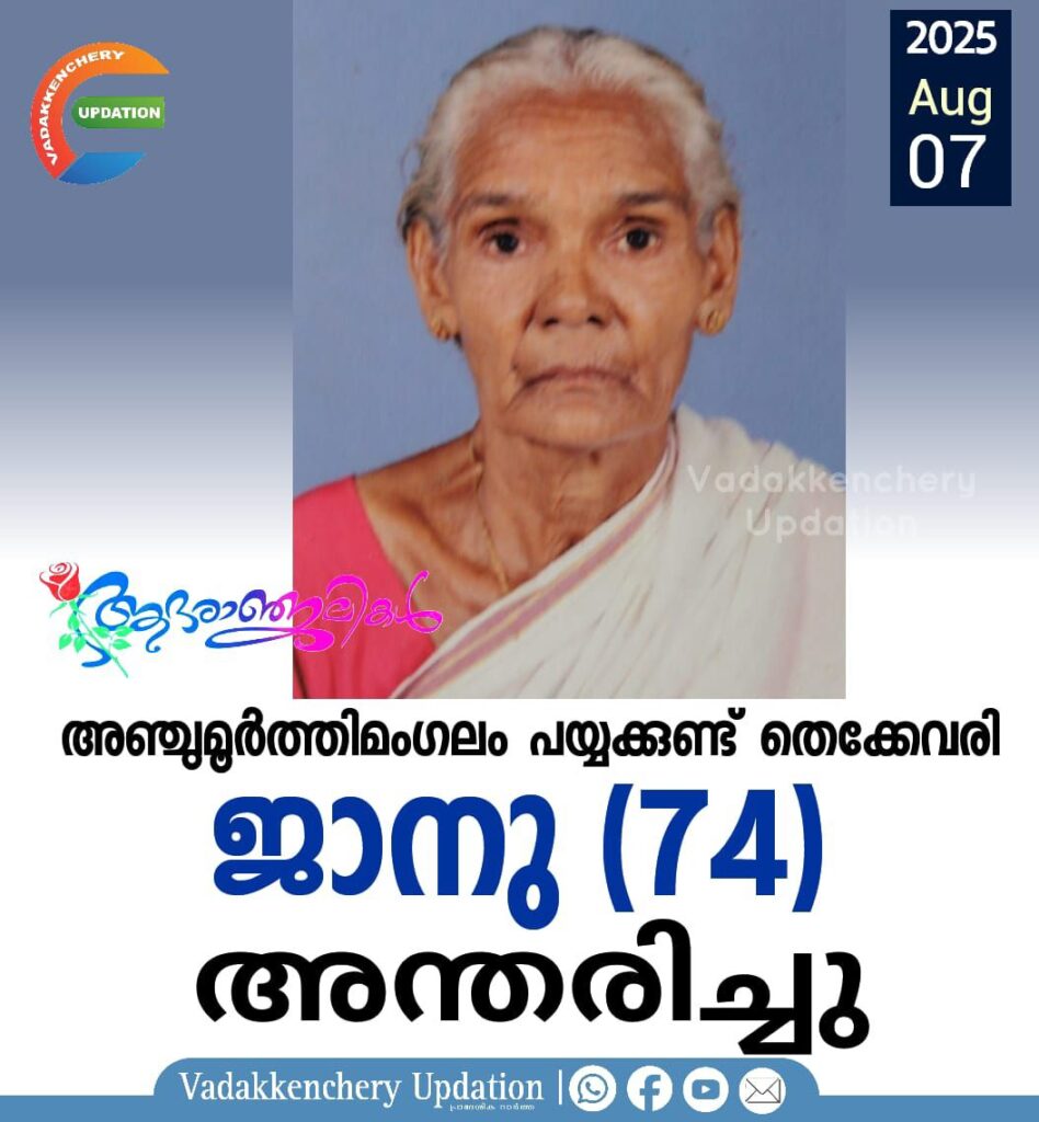 അഞ്ചുമൂർത്തിമംഗലം പയ്യക്കുണ്ട് തെക്കേവരി പരേതയായ അയിച്ചി മകൾ ജാനു (74) അന്തരിച്ചു. സംസ്ക്കാരം നാളെ (08.08.2025 -വെള്ളിയാഴ്ച്ച) കാലത്ത് 10 മണിയ്ക്ക് തിരുവില്വാമല ഐവർ മഠത്തിൽ. മകൻ: കൃഷ്ണൻ കുട്ടി, മരുമകൾ: വിജയകുമാരി സഹോദരങ്ങൾ : പരേതനായ ശിവരാമൻ, വേശു