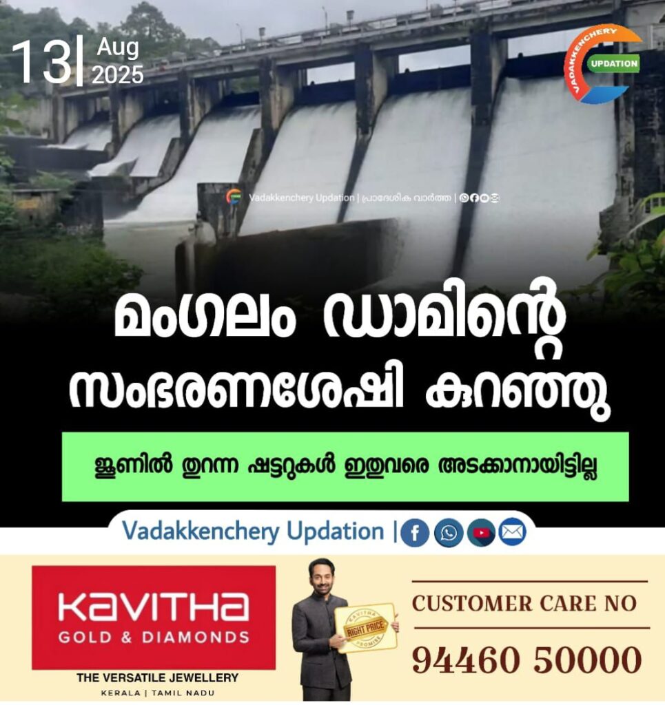 മംഗലം ഡാമിന്റെ സംഭരണശേഷി കുറഞ്ഞു; ജൂണില് തുറന്ന ഷട്ടറുകള് ഇതുവരെ അടക്കാനായിട്ടില്ല.
