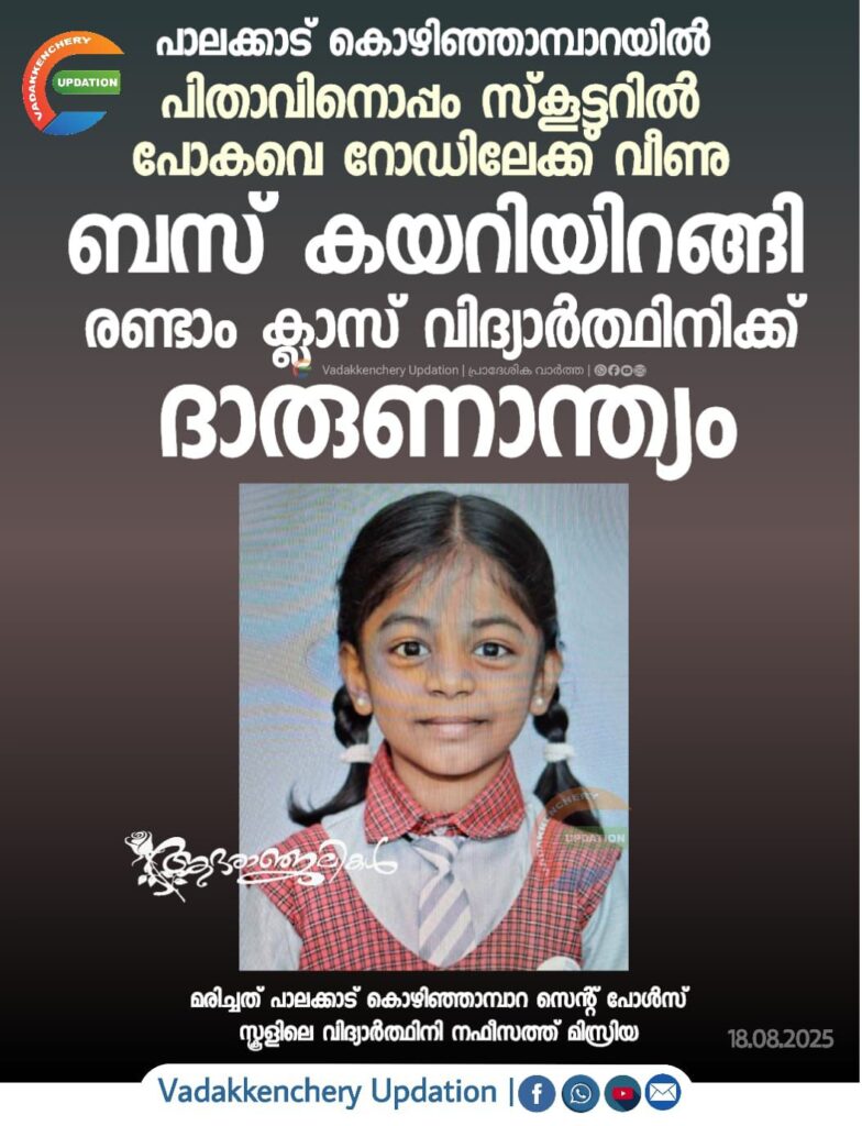 പാലക്കാട് കൊഴിഞ്ഞാമ്പാറയില് ബസ് ശരീരത്തിലൂടെ കയറിയിറങ്ങി വിദ്യാര്ത്ഥിനിക്ക് ദാരുണാന്ത്യം. കൊഴിഞ്ഞാമ്പാറ സെന്റ് പോള്സ് ഇംഗ്ലീഷ് മീഡിയം സ്കൂളിലെ രണ്ടാം ക്ലാസ് വിദ്യാർത്ഥിനിയും കൊഴിഞ്ഞാമ്പാറ പഴണിയാര്പാളയം സ്വദേശികളുടെ മകളുമായ നഫീസത്ത് മിസ്രിയയാണ് മരിച്ചത്. കൊഴിഞ്ഞാമ്പാറ അത്തിക്കോടുവെച്ചാണ് അപകടം നടന്നത്.പിതാവിനൊപ്പം സ്കൂളിലേക്ക് ബൈക്കില് പോകുന്നതിനിടെയാണ് നഫീസത്ത് അപകടത്തിൽപ്പെട്ടത്. റോഡിലെ കുഴിയിൽ വീണ് ബൈക്ക് മറിയുകയും കുട്ടി റോഡിലേക്ക് തെറിച്ചുവീഴുകയുമായിരുന്നു എന്നാണ് പ്രാഥമിക വിവരം. തൊട്ടുപിന്നാലെ അമിതവേഗത്തിലെത്തിയ ബസ് കുട്ടിയുടെ ശരീരത്തിലൂടെ കയറിയിറങ്ങുകയായിരുന്നു.സംഭവത്തിന്റെ സിസിടിവി ദൃശ്യങ്ങൾ പുറത്തുവന്നിട്ടുണ്ട്. കുട്ടിയുടെ മൃതദേഹം അത്തികോട്ടെ സ്വകാര്യ ആശുപത്രിയിൽ സൂക്ഷിച്ചിരിക്കുകയാണ്. പോസ്റ്റുമോർട്ടം നടപടികൾക്കായി പാലക്കാട് ജില്ലാ ആശുപത്രിയിലേക്ക് മാറ്റും. അപകടകാരണം കണ്ടെത്താൻ പൊലീസും മോട്ടോർ വാഹന വകുപ്പും അന്വേഷണം ആരംഭിച്ചു.