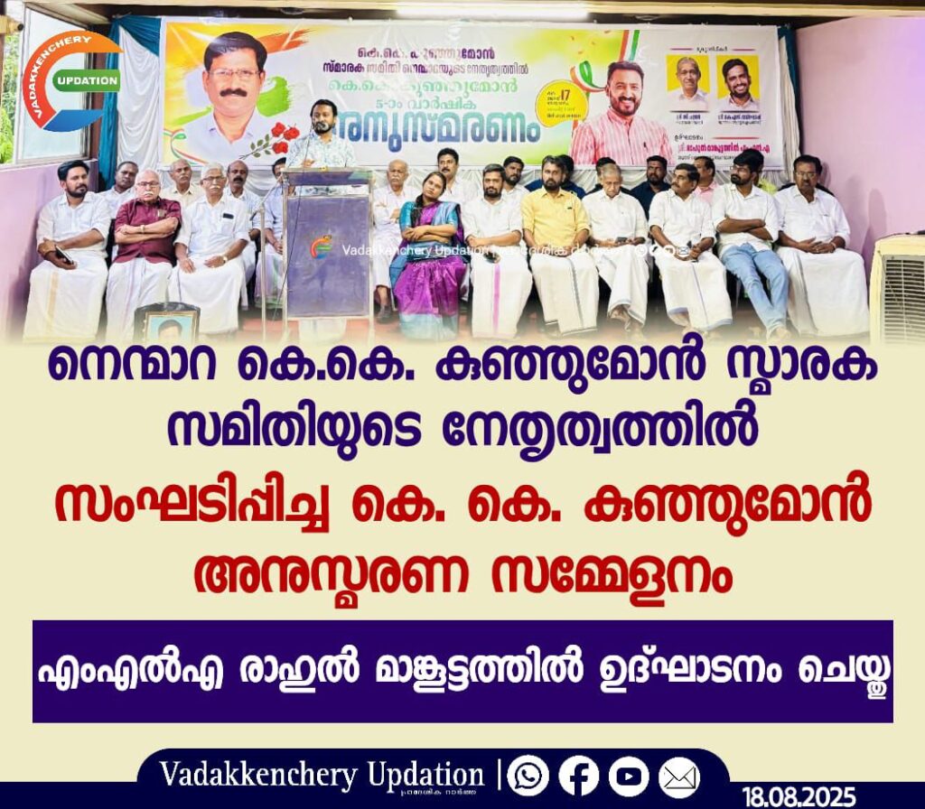 നെന്മാറ കെ.കെ. കുഞ്ഞുമോൻ സ്മാരക സമിതിയുടെ നേതൃത്വത്തിൽ സംഘടിപ്പിച്ച കെ. കെ. കുഞ്ഞുമോൻ അനുസ്മരണ സമ്മേളനം എംഎൽഎ രാഹുൽ മാങ്കൂട്ടത്തിൽ ഉദ്ഘാടനം ചെയ്തു