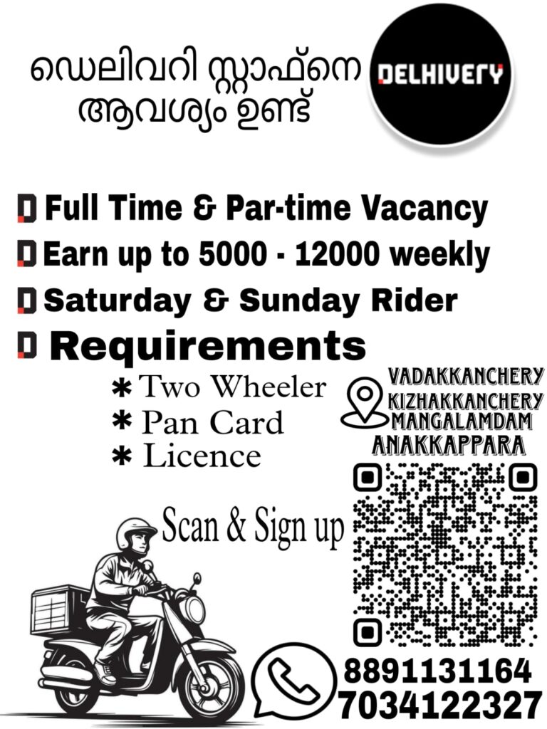 ഡെലിവറി സ്റ്റാഫിനെ ആവശ്യം ഉണ്ട്