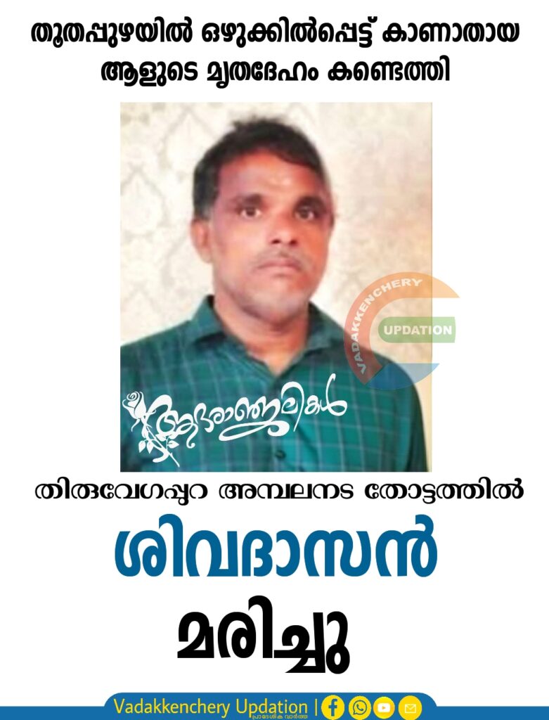 തിരുവേഗപ്പുറയിലെ തൂതപ്പുഴയിൽ ഒഴുക്കിൽപ്പെട്ട് കാണാതായ ആളുടെ മൃതദേഹം കണ്ടെത്തി. തിരുവേഗപ്പുറ അമ്പലനട തോട്ടത്തിൽ ശിവദാസൻ്റ മൃതദേഹമാണ് കണ്ടെത്തിയത്.