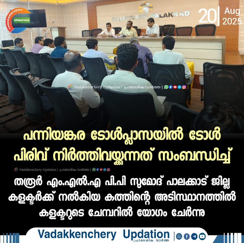 പന്നിയങ്കര ടോൾ പ്ലാസ ടോൾ പിരിവ് നിർത്തിവയ്ക്കുന്നത് സംബന്ധിച്ച് തരൂർ എം.എൽ.എ പി.പി സുമോദ് പാലക്കാട് ജില്ല കളക്ടർക്ക് നൽകിയ കത്തിന്റെ അടിസ്ഥാനത്തിൽ കളക്ടറുടെ ചേമ്പറിൽ യോഗം ചേർന്നു