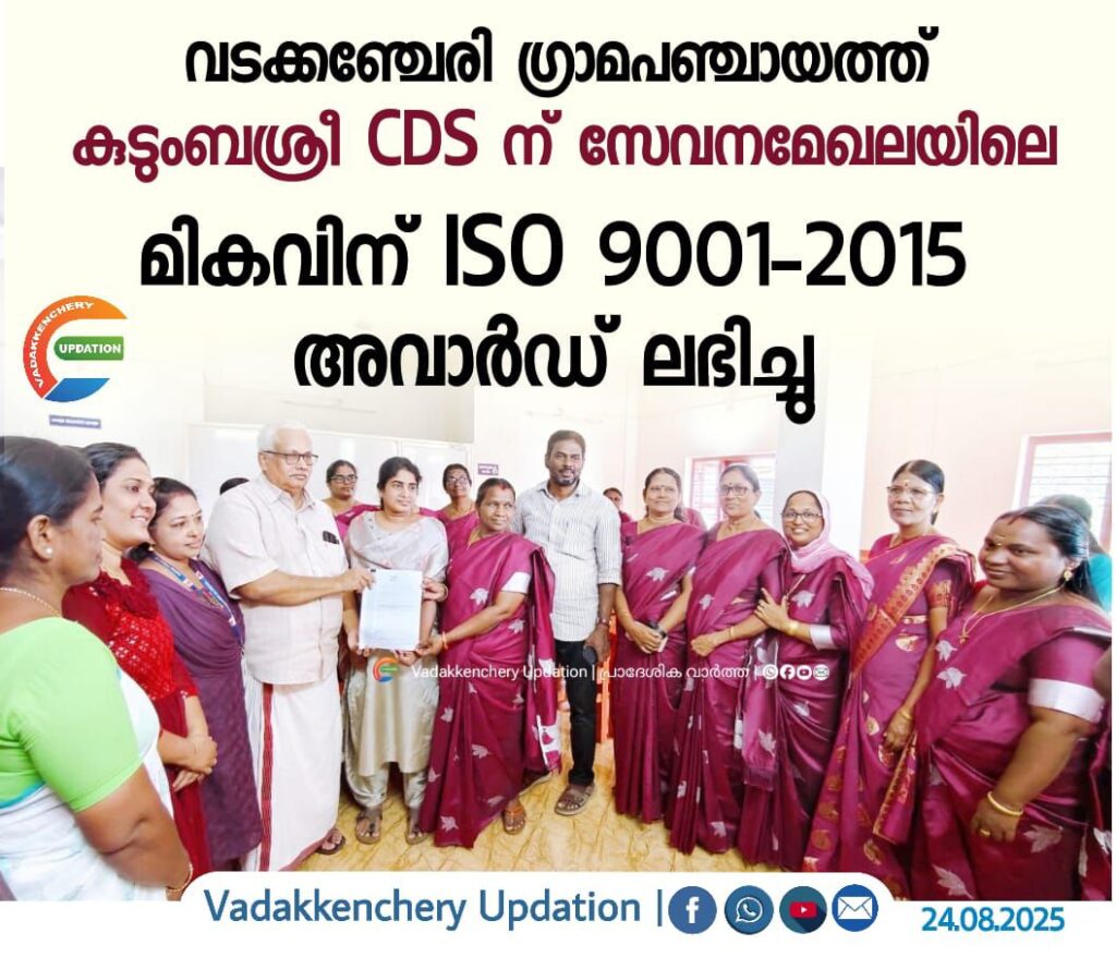 വടക്കഞ്ചേരി കുടുംബശ്രീ CDS ന് ISO 9001-2015 അംഗീകാരം.