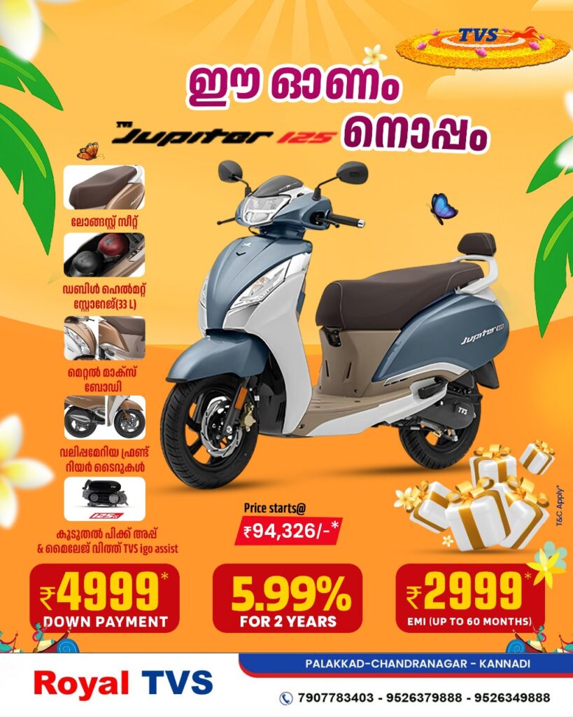 🔳 ഓണം MOOD ON… പാലക്കട്ടെ ഹോൾസെയിൽ ഡീലറായ റോയൽ ടി.വി.എസിൽ ഓഫറുകളുടെ പൊടി പൂരം…