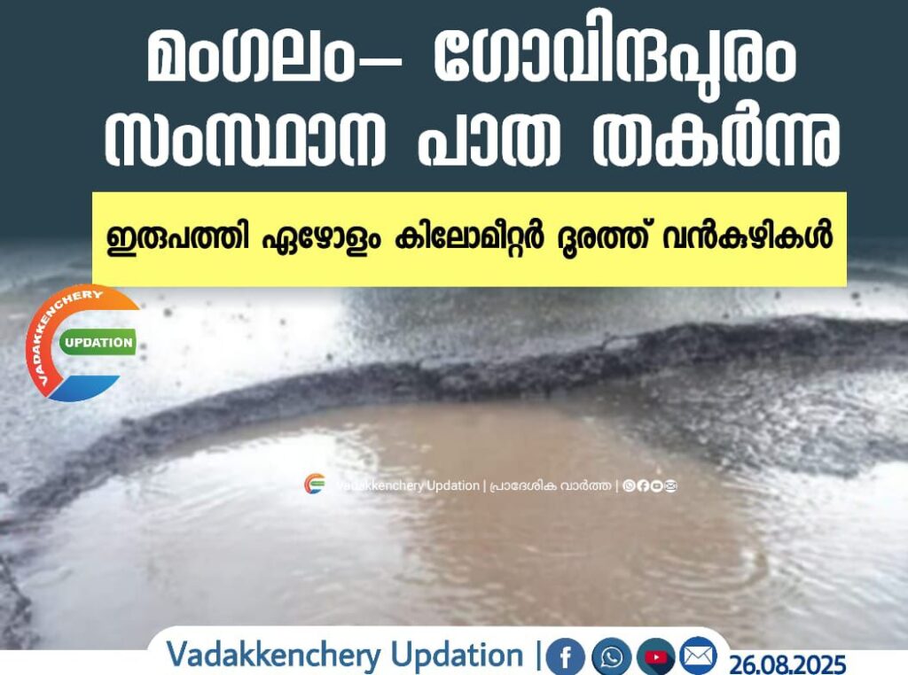 ഇടവേളക്കുശേഷം വീണ്ടും മഴ കനത്തപ്പോൾ മംഗലം-ഗോവിന്ദാപുരം സംസ്ഥാനപാത തകർന്ന് തരിപ്പണമായി. മംഗലം-ഗോവിന്ദാപുരം സംസ്ഥാനപാത കൂടാതെ പഞ്ചായത്ത് റോഡുകളടക്കം എല്ലാ റോഡു കളും തകർന്നു.നെന്മാറ – വടക്കഞ്ചേരി സംസ്ഥാനപാതയിൽ നിറയെ കുഴികളായതിനാൽ അപകടങ്ങളും പതിവാകുകയാണ്. നെന്മാറയിൽ നിന്നും വടക്കഞ്ചേരി മംഗലം പാതയിലേക്ക് നീളുന്ന റോഡിൻറെ പല ഭാഗത്തും ഇരുപത്തി ഏഴോളം കിലോമീറ്റർ ദൂരത്തോളമാണ് വൻകുഴികൾ രൂപപ്പെട്ടിരിക്കുന്നത്. മഴക്കാലം ആയതോടെയാണ് കുഴികൾ അപകടം വിളിച്ചുവരുത്തുന്നത്. ഒന്നര അടിയോളം ആഴത്തിലുള്ള കുഴികൾ പലതും വെള്ളം നിറഞ്ഞ് റോഡ് കാണാത്ത അവസ്ഥയാണ്. പകലും പ്രത്യേകിച്ച് രാത്രിയിലും അപകടങ്ങൾ പതിവാകുന്നു. എതിരെ വരുന്ന വാഹനങ്ങളുടെ പ്രകാശത്താൽ കുഴികൾ കാണാത്ത അവസ്ഥയാണ്. റോഡിൻറെ ഇരുഭാഗത്തും വൻമരങ്ങൾ നിറഞ്ഞു നിൽക്കുകയാണ്. ഇവ യിൽ നിന്നും വെള്ളം വീണാണ് വൻകുഴികൾ രൂപപ്പെടുന്നത്. ശരിയായ പണിയുടെ അഭാവവും കുഴികൾ രൂപപ്പെടാൻ കാരണമാണ്. സമയാസമയത്തുള്ള അറ്റകുറ്റപ്പണി നടത്താത്തതും പ്രശ്നമാകുന്നു.