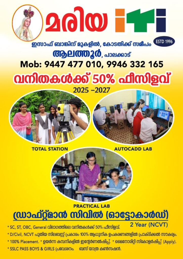 D/Civil, NCVT പുതിയ സിലബസ്സ് പ്രകാരം 100% ആധുനിക ഉപകരണങ്ങളിൽ പ്രാക്ടിക്കൽ സൗകര്യം.