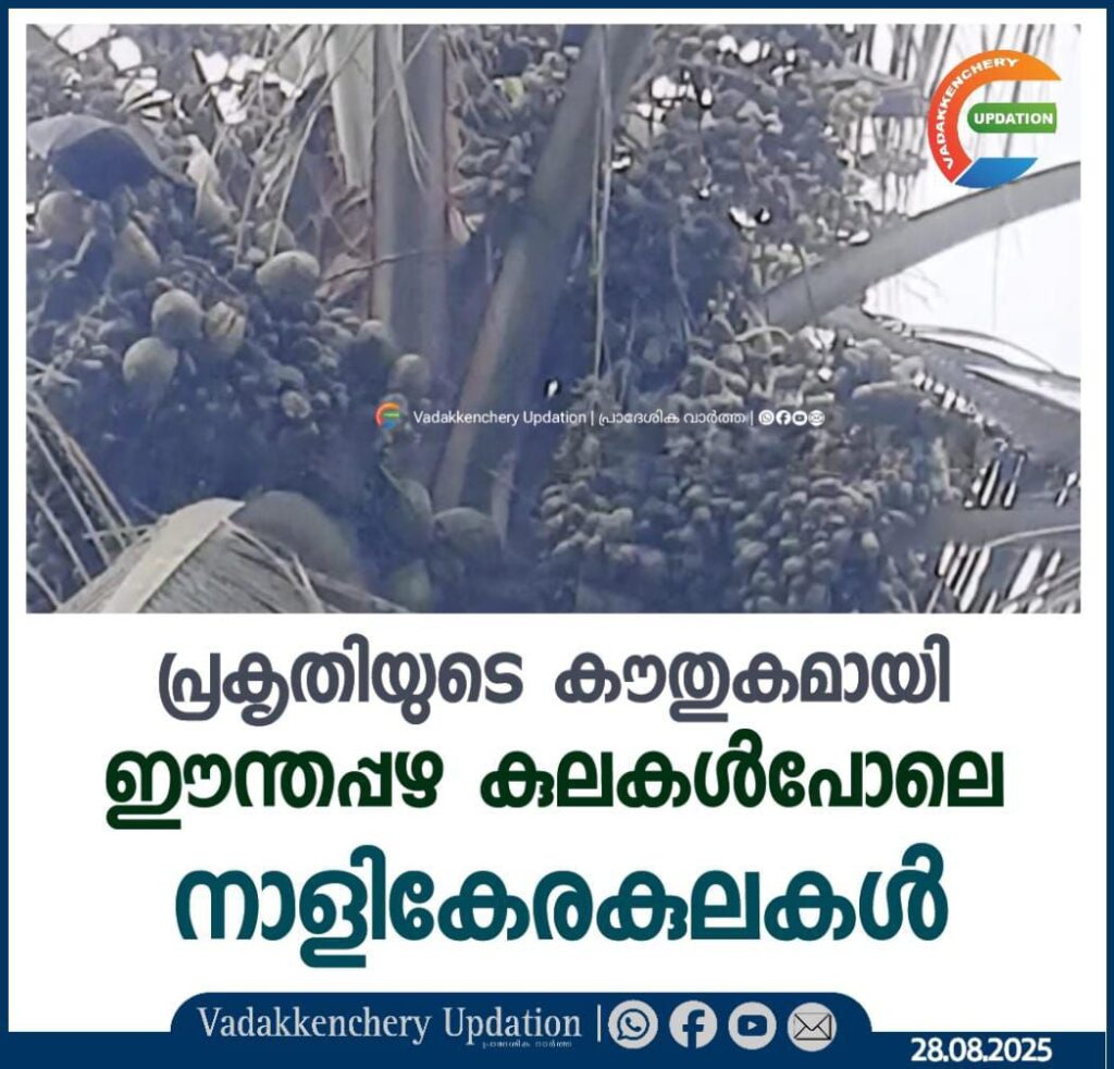 പ്രകൃതിയുടെ കൗതുകമായി ഈന്തപ്പഴ കുലകള്പോലെ നാളികേരകുലകള്