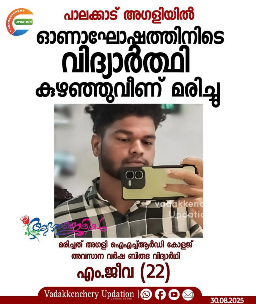 ഓണാഘോഷം കഴിഞ്ഞു കോളജിൽ നിന്നു വീട്ടിലേക്കു മടങ്ങാനൊരുങ്ങുന്നതിനിടെയുണ്ടായ നെഞ്ചുവേദനയെത്തുടർന്ന് ആശുപത്രിയിൽ പ്രവേശിപ്പിച്ച വിദ്യാർഥി മരിച്ചു. അഗളി ഐഎച്ച്ആർഡി കോളജ് അവസാന വർഷ ബിരുദ വിദ്യാർഥി എം.ജീവയാണ് (22) മരിച്ചത്.
