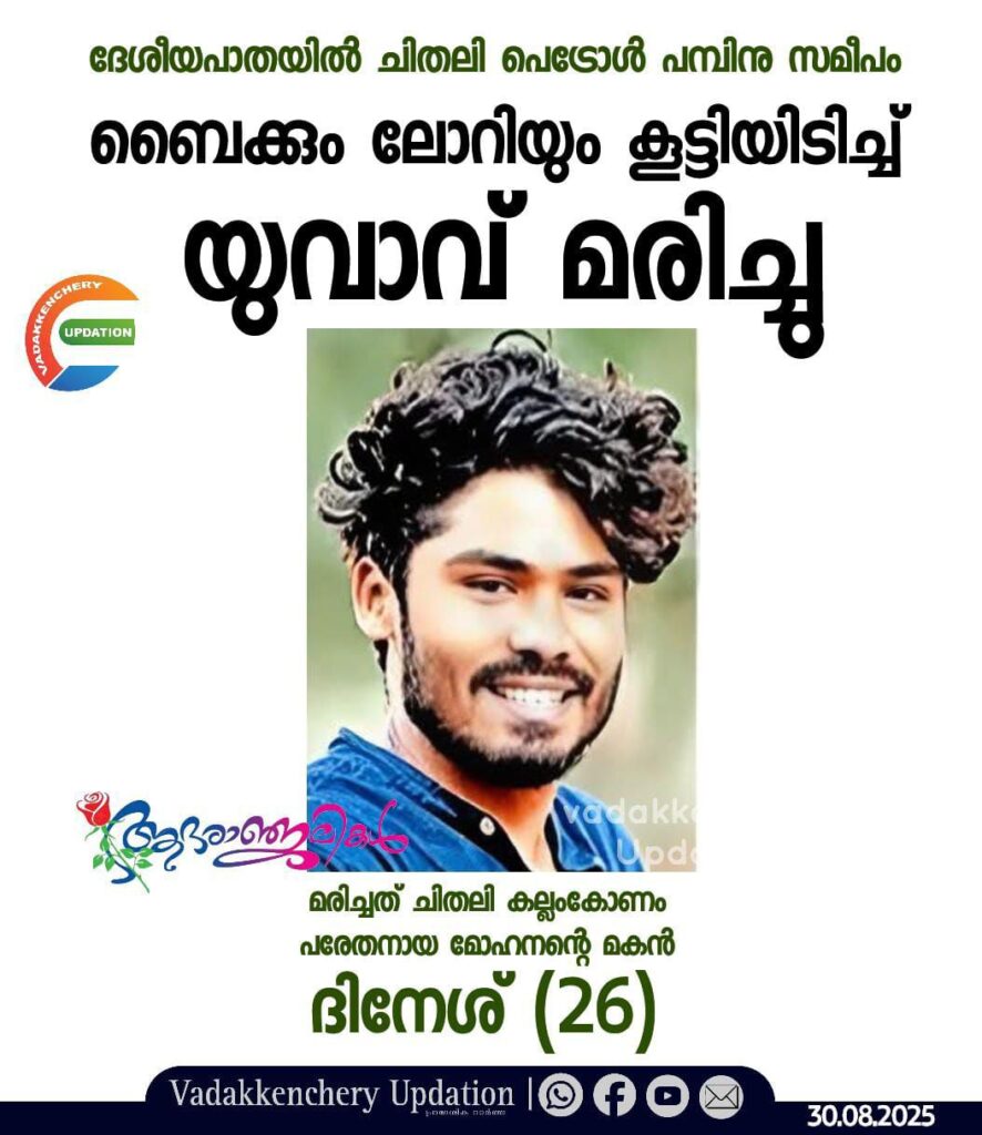 ദേശീയപാതയിൽ ചിതലി പെട്രോൾ പമ്പിനു സമീപം ഇന്നലെ രാത്രി ലോറിയും ബൈക്കും കൂട്ടിയിടിച്ചുണ്ടായ അപകടത്തിൽ ബൈക്ക് യാത്രികൻ മരിച്ചു. ചിതലി കല്ലംകോണം പരേതനായ മോഹനന്റെ മകൻ ദിനേശ് (26) ആണു മരിച്ചത്. പെയ്ന്റിങ് തൊഴിലാളിയായ ദിനേശ് ജോലി കഴിഞ്ഞ് പാലക്കാട്ടു നിന്നു വീട്ടിലേക്കുള്ള യാത്രയ്ക്കിടെയായിരുന്നു അപകടം. പരുക്കേറ്റ ദിനേശിനെ ജില്ലാ ആശുപത്രിയിൽ എത്തിച്ചെങ്കിലും രക്ഷിക്കാനായില്ല. സംസ്കാരം ഇന്നു പോസ്റ്റ്മോർട്ടത്തിനു ശേഷം. അവിവാഹിതനാണ്. അമ്മ: ഇന്ദിര. സഹോദരങ്ങൾ: മനേഷ്, മഹേഷ്.