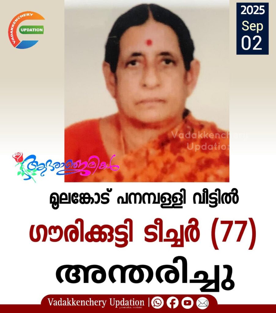 മൂലങ്കോട് പനമ്പള്ളി വീട്ടിൽ ഗൗരിക്കുട്ടി ടീച്ചർ (77) അന്തരിച്ചു