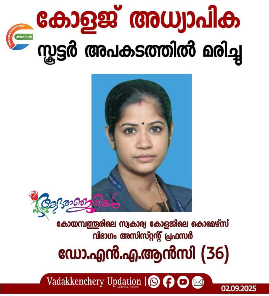 ഓണാഘോഷത്തിനായി കോളജിലേക്കു പോകുമ്പോൾ സ്കൂട്ടർ അപകടത്തിൽ അധ്യാപിക മരിച്ചു. കോയമ്പത്തൂരിലെ സ്വകാര്യ കോളജിലെ കൊമേഴ്സ് വിഭാഗം അസിസ്റ്റന്റ് പ്രഫസർ ഡോ.എൻ.എ.ആൻസി (36) ആണു മരിച്ചത്. ഇന്നലെ രാവിലെ 10.50നു കഞ്ചിക്കോട് റെയിൽവേ സ്റ്റേഷൻ ജംക്ഷനു സമീപമാണ് അപകടം. സ്കൂട്ടറിൽ പോവുകയായിരുന്ന ആൻസിയെ അജ്ഞാതവാഹനം ഇടിച്ചുവീഴ്ത്തിയെന്നായിരുന്നു ആദ്യവിവരം.സിസിടിവി ദൃശ്യങ്ങൾ പരിശോധിച്ചപ്പോൾ സ്കൂട്ടറിനു പിന്നാലെ മറ്റു വാഹനങ്ങൾ ഉണ്ടായിരുന്നില്ലെന്നു വ്യക്തമായി.
