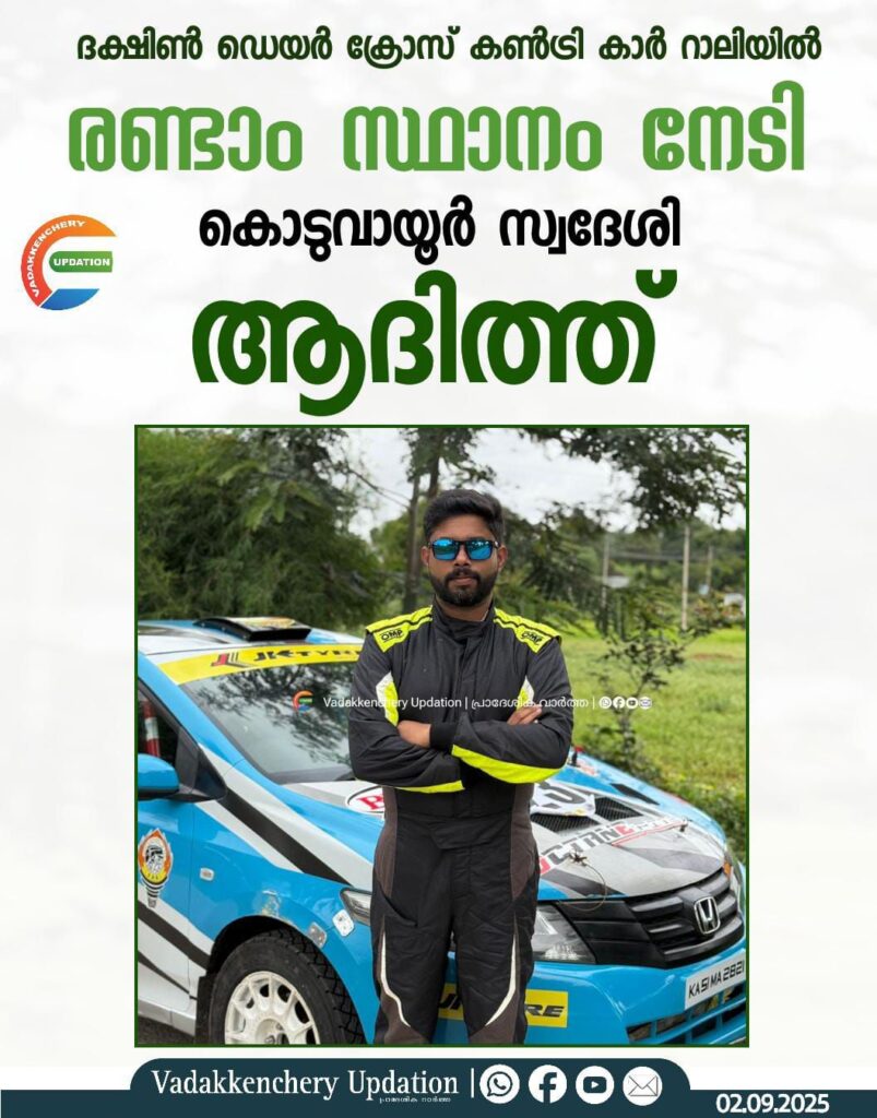 കാര് റാലിയില് തനതായ മുദ്ര പതിപ്പിക്കുന്ന കൊടുവായൂര് നവക്കോട് സ്വദേശി കെ.സി. ആദിത്തിന് വീണ്ടും നേട്ടങ്ങളുടെ നെറുകയില്. കഴിഞ്ഞ ദിവസം ആന്ധ്രാപ്രദേശിലെ അനന്തപൂരില് വെച്ച് നടന്ന മോട്ടോര് സ്പോര്ട്സ് ഇന്കോര്പ്പറേറ്റഡ് 14 ാമത് ദക്ഷിണ് ഡെയര് ക്രോസ് കണ്ട്രി കാർ റാലിയിലാണ് മികച്ച് നേട്ടം കൈവരിച്ച് കേരളത്തിന്റെ അഭിമാനമായി മാറിയത്. ക്രോസ് കണ്ട്രി മത്സരത്തില് ആദിത്തും, നാവിഗേറ്ററുമായ കെ.എന്.ഹരീഷും ചേര്ന്ന് 1850 സിസിയില് ടി വൺ കാറ്റഗറിയില് രണ്ടാം സ്ഥാനവും, ഓവര് ആള് റാലിയും മൂന്നാം സ്ഥാനവും നേടിയാണ് വിജയം കൊയതത്. വി.എം മോട്ടോര് സ്പോർട്സ് ഫൗണ്ടേഷനാണു റാലിയില് ഇരുവരുടെയും സ്പോണ്സര്.