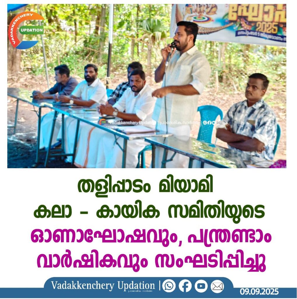 തളിപ്പാടം മിയാമി കലാ – കായിക സമിതിയുടെ ഓണാഘോഷവും, പന്ത്രണ്ടാം വാർഷികവും സംഘടിപ്പിച്ചു. ആഘോഷ പരിപാടികൾ DCC ജനറൽ സെക്രട്ടറി കെ. ജി.എൽദോ ഉദ്ഘാടനം ചെയ്തു. എ. മോഹൻദാസ് അധ്യക്ഷത വഹിച്ചു. പ്രദീപ് നെന്മാറ, വിനീഷ് കരിമ്പാറ, ബിജു കണ്ണമ്പ്ര, ടി. എൻ. അനിൽ ബാബു, കെ.സജീഷ്, എന്നിവർ പ്രസംഗിച്ചു.
