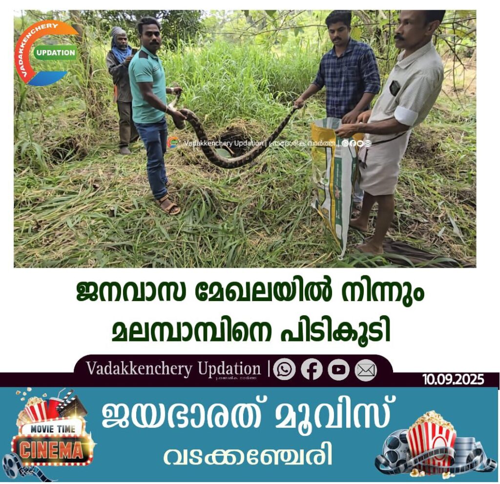 കിഴക്കഞ്ചേരി ഇളവംപാടം ആണ്ടിമാൻമന്ദിരം ജി . മനോജിന്റെ തോട്ടത്തിൽ നിന്ന് മലമ്പാമ്പിനെ പിടിച്ചു. മംഗലംഡാം കരിങ്കയം ഫോറസ്റ്റ് ഓഫീസിലെ പ്രമോദിൻ്റെ നേതൃത്വത്തിൽ പിടിച്ച പാമ്പിനെ പിന്നീട് നെല്ലിയാമ്പതി വനത്തിൽ തുറന്നുവിടാനായി അധികൃതർ കൊണ്ടുപോയി.