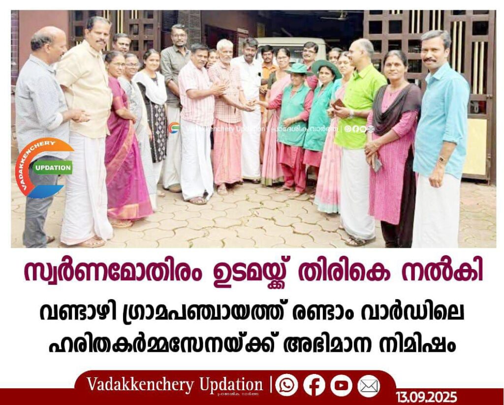 വണ്ടാഴി ഗ്രാമപഞ്ചായത്ത് രണ്ടാം വാർഡിലെ ഹരിതകർമ്മസേനാംഗങ്ങളായ ഗിരിജയും ചന്ദ്രികയും മാതൃകാപരമായ പ്രവൃത്തിയിലൂടെ എല്ലാവരുടെയും പ്രശംസ നേടി. വീടുകളിൽ നിന്നുള്ള പ്ലാസ്റ്റിക് ശേഖരിച്ചു വേസ്റ്റ് തരംതിരിക്കുന്നതിനിടയിൽ ഇവർക്ക് ഒരു സ്വർണമോതിരം കണ്ടെത്തി.