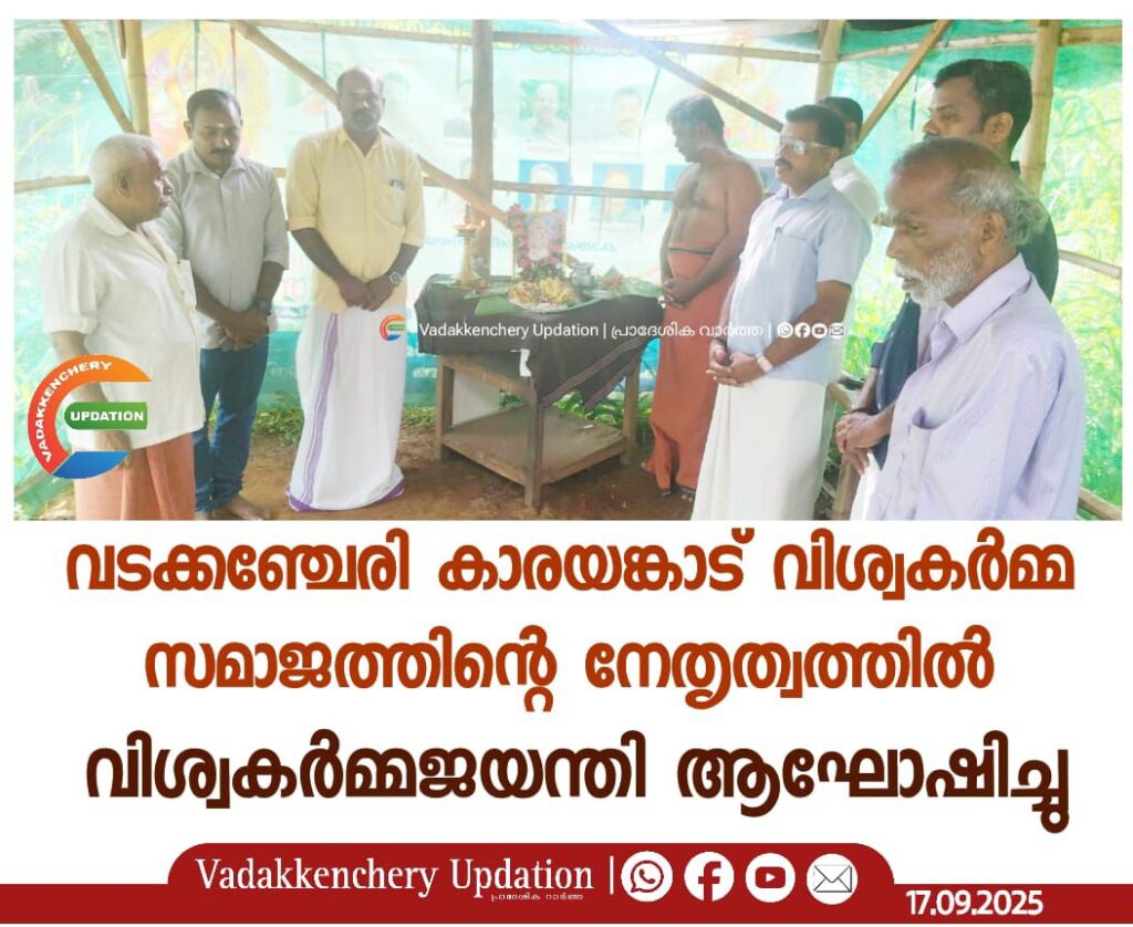 വടക്കഞ്ചേരി കാരയങ്കാട് വിശ്വകർമ്മ സമാജത്തിൻ്റെ നേതൃത്വത്തിൽ വിശ്വകർമ്മജയന്തി ആഘോഷിച്ചു. വിശ്വകർമ്മ പൂജയും പുഷ്പാർച്ചനയും നടത്തി. യോഗത്തിൽ വി എം മുരുകേശൻ സ്വാഗതം പറഞ്ഞു. സമാജം പ്രസിഡൻറ് കെ എസ് ഗിരീഷ് അധ്യക്ഷത വഹിച്ച യോഗത്തിൽ വി . പി. ശെൽവകുമാർ, വി. എം സന്തോഷ് , വി ആർ രതീഷ്, വി ആർ രാജേഷ്, വി കെ കുമാർ എന്നിവർ പങ്കെടുത്ത് സംസാരിച്ചു. ചടങ്ങിൽ പ്രസാദവിതരണവും നടത്തി