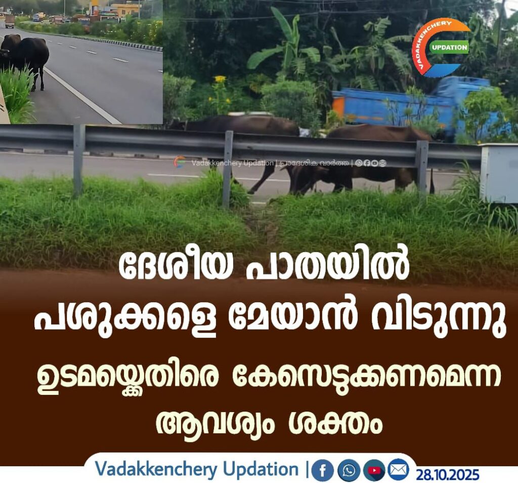 ദേശീയ പാതയിൽ വടക്കഞ്ചേരി മംഗലം പാലം മുതൽ റോയൽ ജങ്ഷൻ വരേയുള്ള തൃശ്ശൂർ ഭാഗത്തേക്കുള്ള റോഡിൽ സ്ഥിരമായി പശുക്കളെ മേയാൻ വിടുന്നത് വലിയ അപകടം ക്ഷണിച്ചു വരുത്തുമെന്ന ആശങ്ക ശക്തമാകുന്നു. മംഗലം ഭാഗത്തുള്ള ഒരു സ്വകാര്യ വ്യക്തിയുടെ രണ്ടു പശുക്കളേയാണ് സ്ഥിരമായി ദേശീയ പാതയിലേക്ക് അഴിച്ചു വിടുന്നത്.