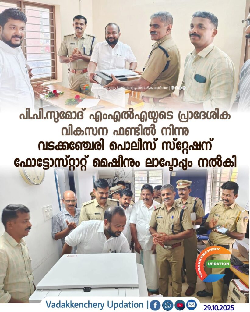 പി.പി.സുമോദ് എംഎൽഎയുടെ പ്രാദേശിക വികസന ഫണ്ടിൽ നിന്നു വടക്കഞ്ചേരി പൊലീസ് സ്റ്റേഷന് ഫോട്ടോസ്റ്റാറ്റ് മെഷീനും ലാപ്ടോപ്പും നൽകി