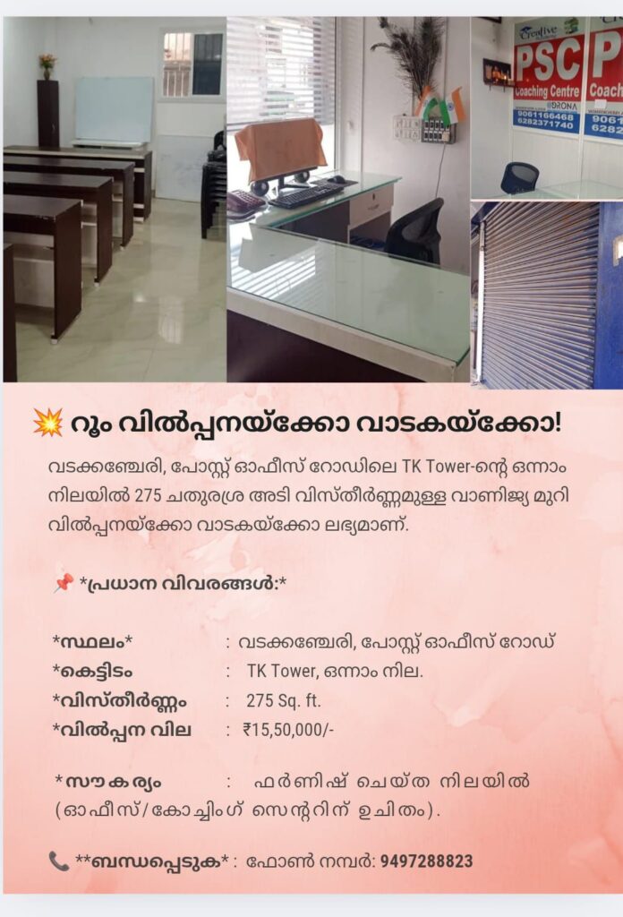 👉സൗകര്യം: ഫർണിഷ് ചെയ്ത നിലയിൽ (ഓഫീസ്/കോച്ചിംഗ് സെൻ്ററിന് ഉചിതം).