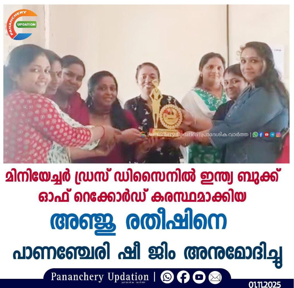 മിനിയേച്ചർ ഡ്രസ് ഡിസൈനിൽ ഇന്ത്യ ബുക്ക് ഓഫ് റെക്കോർഡ് കരസ്ഥമാക്കിയ കണ്ണാറ സ്വദേശി അഞ്ജു രതീഷിനെ പാണഞ്ചേരി ഷീ ജിം അനുമോദിച്ചു. ട്രെയിനർ സുനിത ജയന്റെ നേതൃത്വത്തിൽ ഉപഹാരം കൈമാറി. ഇനിയും ഉയരങ്ങളിലെത്തി ഗിന്നസ് റെക്കോർഡ് കരസ്ഥമാക്കാൻ കഴിയട്ടെ എന്ന് ആശംസിച്ചു.