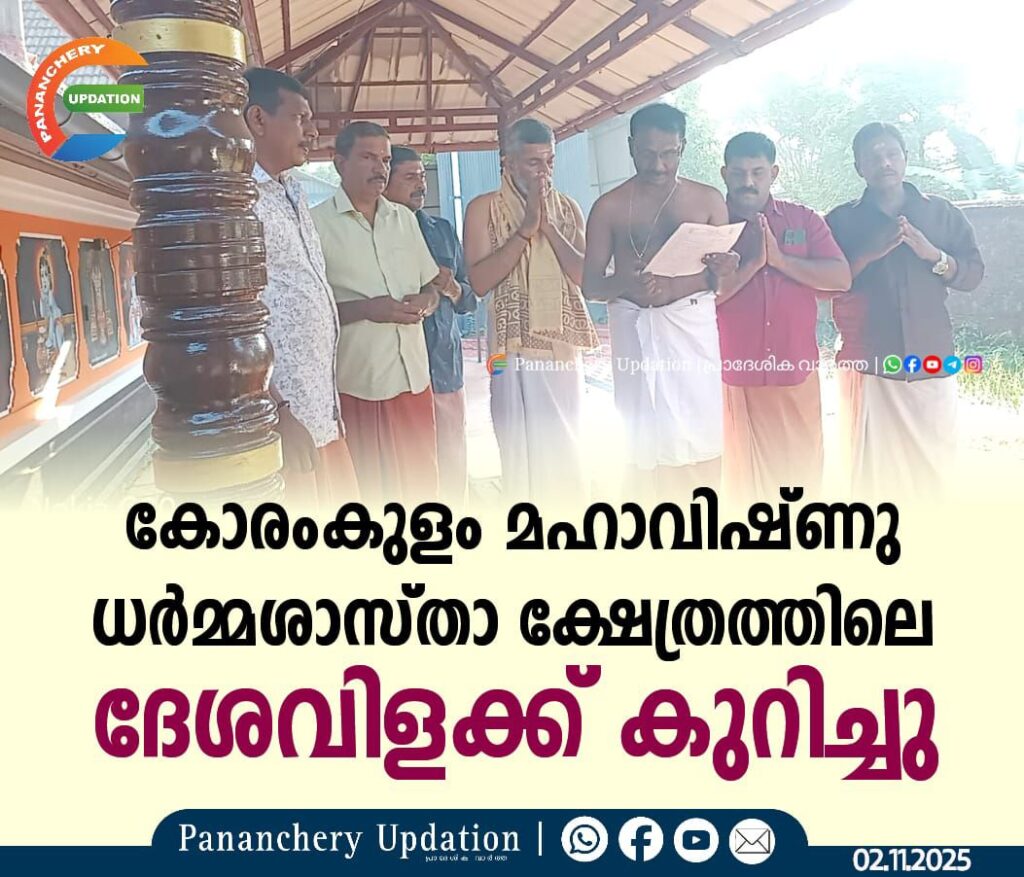 തെക്കുംപാടം കോരംകുളം മഹാവിഷ്ണുധർമ്മശാസ്താ ക്ഷേത്രത്തിലെ ദേശവിളക്ക് കുറിച്ചു. മേൽശാന്തി ശക്തി പ്രസാദ് നമ്പൂതിരിയുടെ കാർമികത്വത്തിൽ ശാസ്താവിൻ്റെ വിശേഷാൽ പൂജകൾക്കു ശേഷം ഒക്ടോബർ 2 ഞായർ രാവിലെ 8 മണിക്ക് തിരുനടക്കൽ വച്ച് ശരണം വിളിച്ച് വിളക്ക് ചാർത്ത് വായിച്ച് ഉപാസനവിളക്ക് സംഘം പ്രധാനി ശശികുമാർ ക്ഷേത്രം ഭാരവാഹികൾക്ക് കൈമാറി വിളക്ക് കുറിച്ചു. പ്രസിഡൻ്റ് ബിജു KB, സെക്രട്ടറി N Sപീതാംബരൻ ട്രഷറർ, സനോജ് TS ഭാരവാഹികളായ കണ്ണ ദാസ്, ബിജു, അനിയൻ, സതീഷ് എന്നിവർ ചടങ്ങിൽ പങ്കെടുത്തു. നവംബർ 29 ശനിയാഴ്ചയാണ് വിളക്ക് ‘വൈകീട്ട് 7 മണിക്ക് കല്ലിടുക്ക് ദുർഗ്ഗാ ഭഗവതി ക്ഷേത്രത്തിൽ നിന്നാണ് വിളക്കെഴുന്നള്ളിപ്പ്. ദേശവിളക്കിലേക്കും മഹാപ്രസാദ ഊട്ടിലേക്കും എല്ലാവരേയും ക്ഷണിക്കുന്നതായി ക്ഷേത്രംഭാരവാഹികൾ അറിയിച്ചു