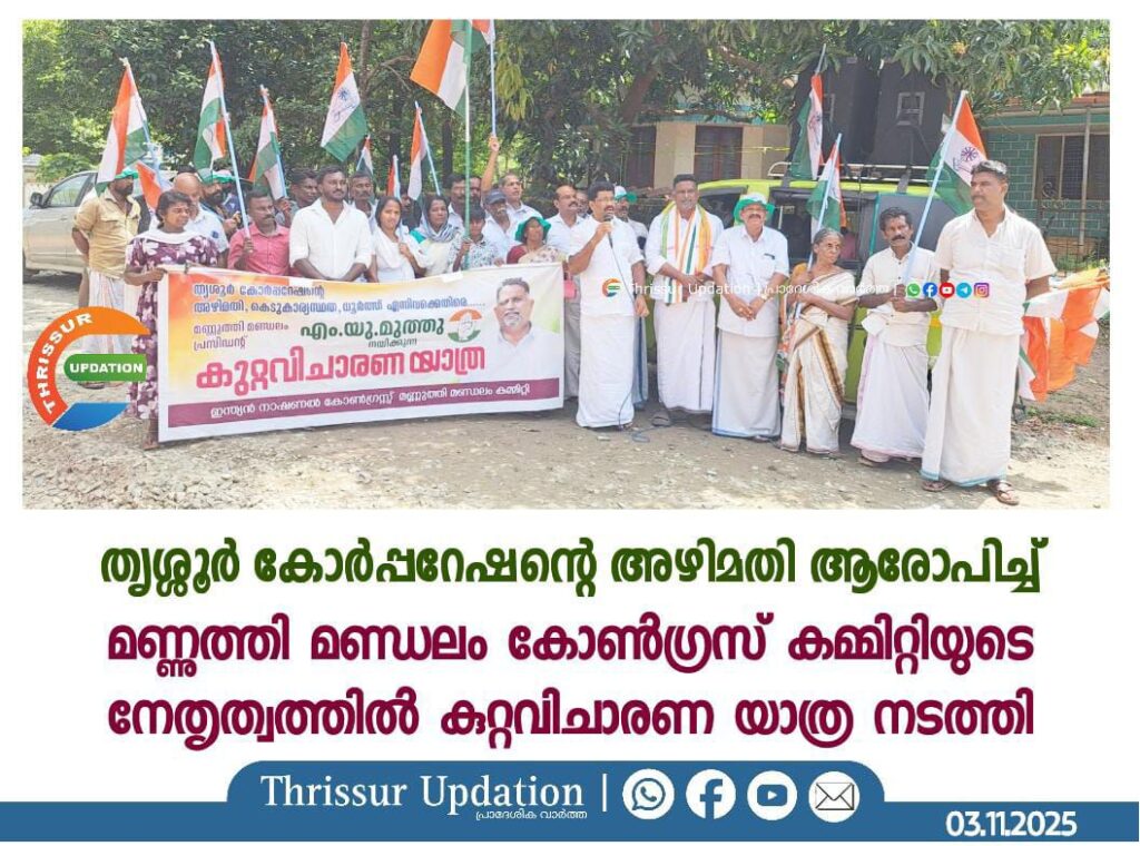 തൃശ്ശൂർ കോർപ്പറേഷന്റെ അഴിമതി ആരോപിച്ച് മണ്ണുത്തി മണ്ഡലം കോൺഗ്രസ് കമ്മിറ്റിയുടെ നേതൃത്വത്തിൽ കുറ്റവിചാരണ യാത്ര നടത്തി