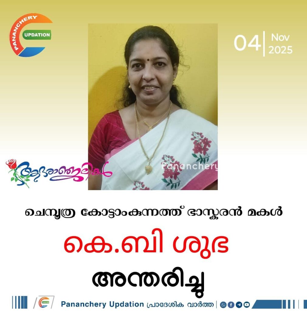 ചെമ്പൂത്ര കോട്ടാം കുന്നത്ത് ഭാസ്കരൻ മകൾ (ചായക്കട ഭാസ്ക്കരേട്ടൻ ) കെ.ബി. ശുഭ അന്തരിച്ചു.
