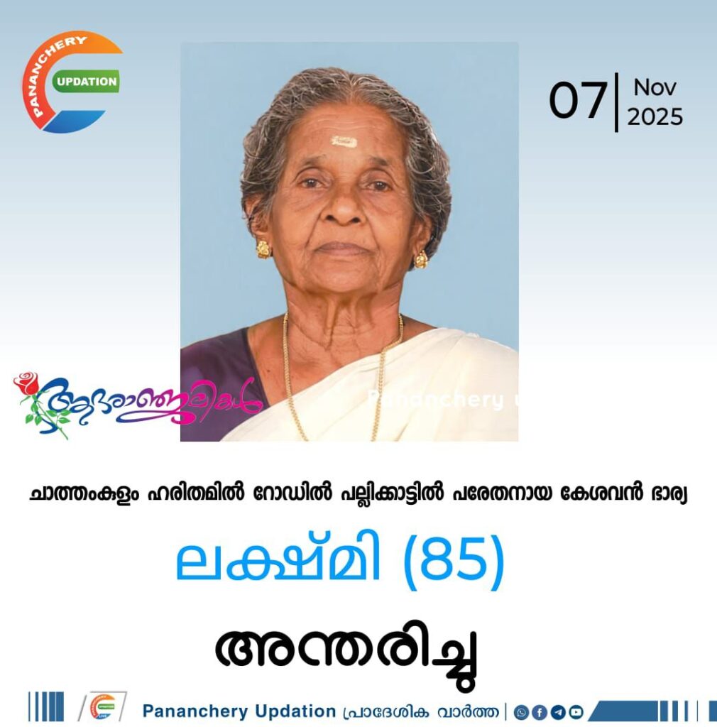 ചാത്തംകുളം ഹരിത മിൽ റോഡിൽ പല്ലിക്കാട്ടിൽ പരേതനായ കേശവൻ ഭാര്യ ലക്ഷ്മി (85) അന്തരിച്ചു. സംസ്കാരം ഇന്ന് (07.11.2025- വെള്ളി )1 മണിക്ക് പാറമേക്കാവ് ശാന്തിഘട്ടിൽ. മക്കൾ :രജിത, രമ, രതി ,സരള, ഉഷ (Late), പമ്പാ വാസൻ