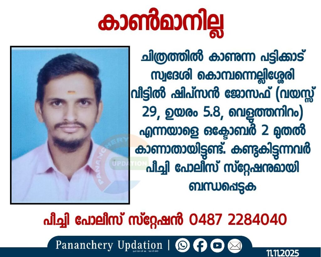 ചിത്രത്തിൽ കാണുന്ന പട്ടിക്കാട് സ്വദേശി കൊമ്പന്നെല്ലിശ്ശേരി വീട്ടിൽ ഷിപ്സൻ ജോസഫ് (വയസ്സ് 29, ഉയരം 5.8, വെളുത്തനിറം) എന്നയാളെ ഒക്ടോബർ 2 മുതൽ കാണാതായിട്ടുണ്ട്. കണ്ടുകിട്ടുന്നവർ പീച്ചി പോലീസ് സ്റ്റേഷനുമായി ബന്ധപ്പെടുക. : പീച്ചി പോലീസ് സ്റ്റേഷൻ 0487 2284040