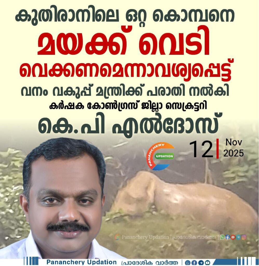 കുതിരാനിലെ ഒറ്റ കൊമ്പനെ മയക്ക് വെടി വെക്കണമെന്നാവശ്യപ്പെട്ട് കർഷക കോൺഗ്രസ് ജില്ലാ സെക്രട്ടറി കെ.പി എൽദോസ് വനം വകുപ്പ് മന്ത്രിക്ക് പരാതി നൽകി