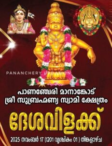 പാണഞ്ചേരി മാനാങ്കോട് ശ്രീ സുബ്രഹ്മണ്യസ്വാമി ക്ഷേത്രത്തിലെ ദേശവിളക്ക് വൃശ്ചികം 1, നവംബർ 17 തിങ്കളാഴ്ച ആഘോഷിക്കും. വൈകീട്ട് 6 മണിക്ക് പാണഞ്ചേരി പാറപ്പുറത്തു നിന്ന് താലങ്ങളുടെയും ശാസ്താം പാട്ടിൻ്റെയും അകമ്പടിയോടെ വിളക്കെഴുന്നള്ളിപ്പ് ആരംഭിച്ച് 9.30 ന് ക്ഷേത്രത്തിൽ എത്തിച്ചേരും. തുടർന്ന് പ്രസാദഊട്ടും ഉണ്ടായിരിക്കുന്നതാണ്.
