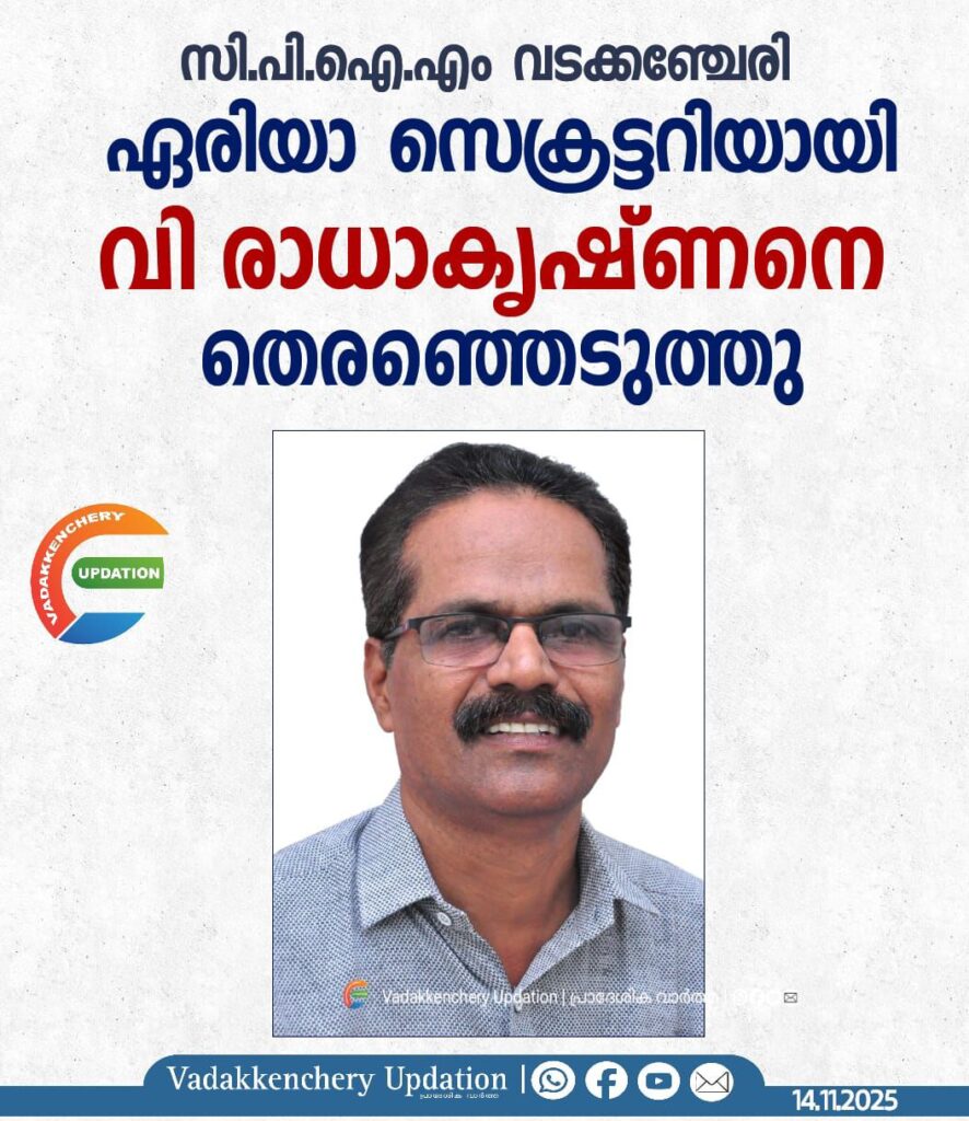 വി രാധാകൃഷ്ണൻ സി പി ഐ എം വടക്കഞ്ചേരി ഏരിയ സെക്രട്ടറി. സി പി ഐ എം വടക്കഞ്ചേരി ഏരിയാ സെക്രട്ടറിയായി വി രാധാകൃഷ്ണനെ തെരഞ്ഞെടുത്തു. നിലവിൽ സെക്രട്ടറിയായിരുന്ന ടി കണ്ണൻ ആലത്തൂർ ബ്ലോക്ക് പഞ്ചായത്ത് സ്ഥാനാർത്ഥിയായി മത്സരിക്കുന്ന സാഹചര്യത്തിലാണ് പുതിയ സെക്രട്ടറിയെ തിരഞ്ഞെടുത്തത്. ദീർഘകാലം സി പി ഐ എം കിഴക്കഞ്ചേരി രണ്ട് ലോക്കൽ സെക്രട്ടറിയായിരുന്ന വി രാധാകൃഷ്ണൻ നിലവിൽ പഞ്ചായത്ത് വൈസ് പ്രസിഡൻ്റാണ്.കെ എസ് കെ ടി യു വടക്കഞ്ചേരി ഏരിയ സെക്രട്ടറിയും, ജില്ലാ കമ്മിറ്റി അംഗവുമാണ്.