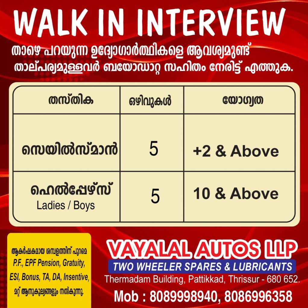 താഴെ പറയുന്ന ഉദ്യോഗാർത്ഥികളെ ആവശ്യമുണ്ട്. താല്പര്യമുള്ളവർ ബയോഡാറ്റ സഹിതം നേരിട്ട് എത്തുക.