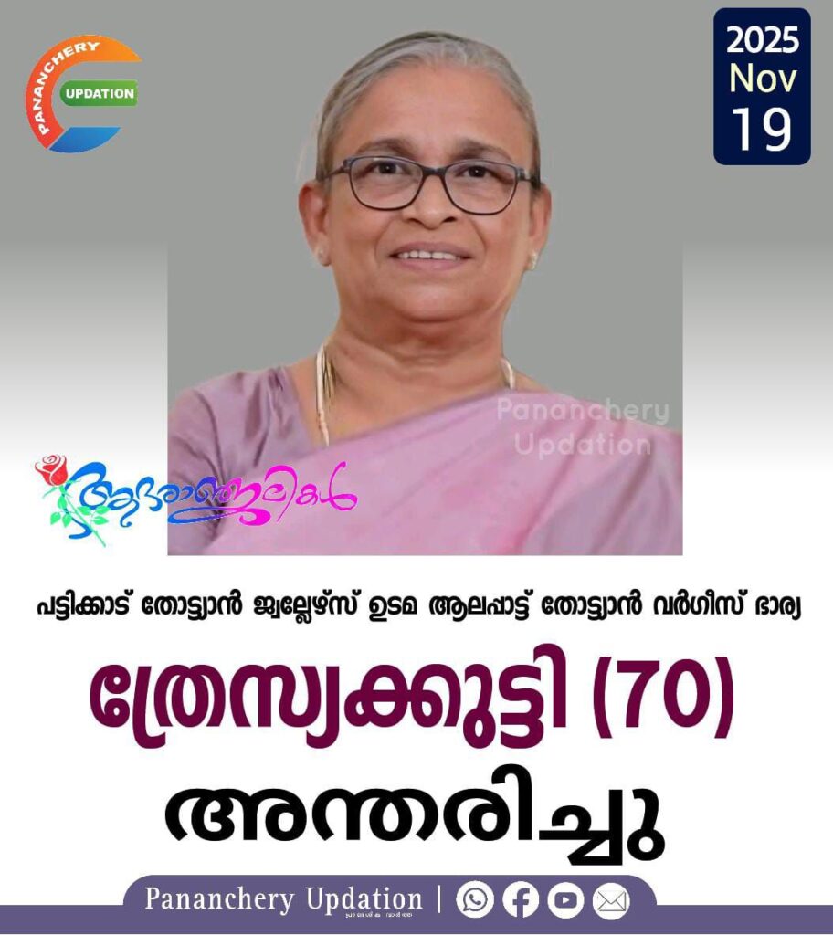 പട്ടിക്കാട് തോട്ട്യാൻ ജ്വല്ലേഴ്സ് ഉടമ ആലപ്പാട്ട് തോട്ട്യാൻ വർഗീസ് ഭാര്യ ത്രേസ്യക്കുട്ടി (70) അന്തരിച്ചു. സംസ്കാരം നാളെ (20.12.2025-വ്യാഴാഴ്ച) രാവിലെ 10.30ന് പട്ടിക്കാട് സെന്റ് ഫ്രാൻസീസ് സേവ്യേഴ്സ് ഫൊറോന പള്ളിയിൽ. മക്കൾ: ഗ്ലാഡിസ്, ഗ്ലിസ. മരുമക്കൾ: ലിജീഷ്, ഡബ്ലിൻ. ഭൗതികശരീരം ഇന്ന് ഉച്ചകഴിഞ്ഞ് രണ്ടുമണിയോടെ കല്ലിടുക്കിലെ വസതിയിൽ എത്തിക്കും.
