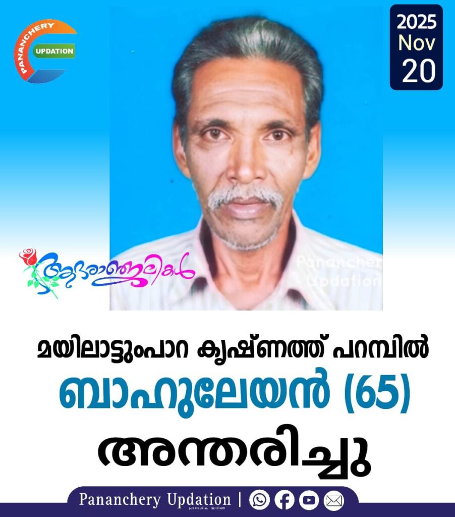 മയിലാട്ടുംപാറ കൃഷ്ണത്ത്പറമ്പിൽ ബാഹുലേയൻ (65) അന്തരിച്ചു. സംസ്കാരം നാളെ (21.11.2025- വെള്ളിയാഴ്ച)രാവിലെ 9.30ന് വടക്കുംപാടം ആത്മാലയത്തിൽ. ഭാര്യ: ഇന്ദിര. മക്കൾ: ഇന്ദുലേഖ, പ്രസാദ്. മരുമക്കൾ: മരുകദാസ്, അംബിക.