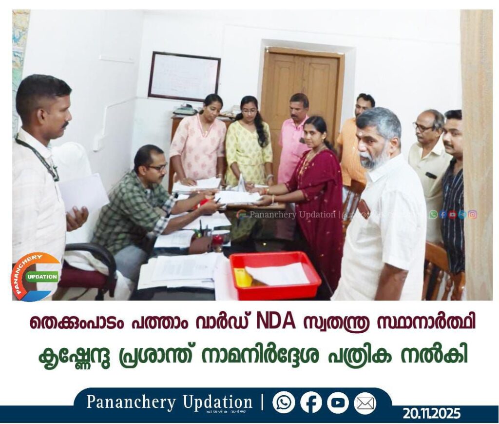 തെക്കുംപാടം പത്താം വാർഡ് NDA സ്വതന്ത്ര സ്ഥാനാർത്ഥി കൃഷ്ണേന്ദു പ്രശാന്ത് നാമനിർദേശ പത്രിക നൽകി. വാർഡ് സംയോജകൻ N.S പീതാംബരൻ , ബൂത്ത് പ്രസിഡൻ്റ് ബിജു കൊല്ലമറ്റം, കോർഡിനേറ്റർമാരായ ജയൻ കണ്ടം പുള്ളി, കണ്ണ ദാസ്, NDA ഭാരവാഹികളായ പ്രബീഷ്, രതീഷ് , വിജയൻ കമ്പിളി ബിനോഷ്, പ്രശാന്ത് എന്നിവരും പാർട്ടി പ്രവർത്തകരും പങ്കെടുത്തു.