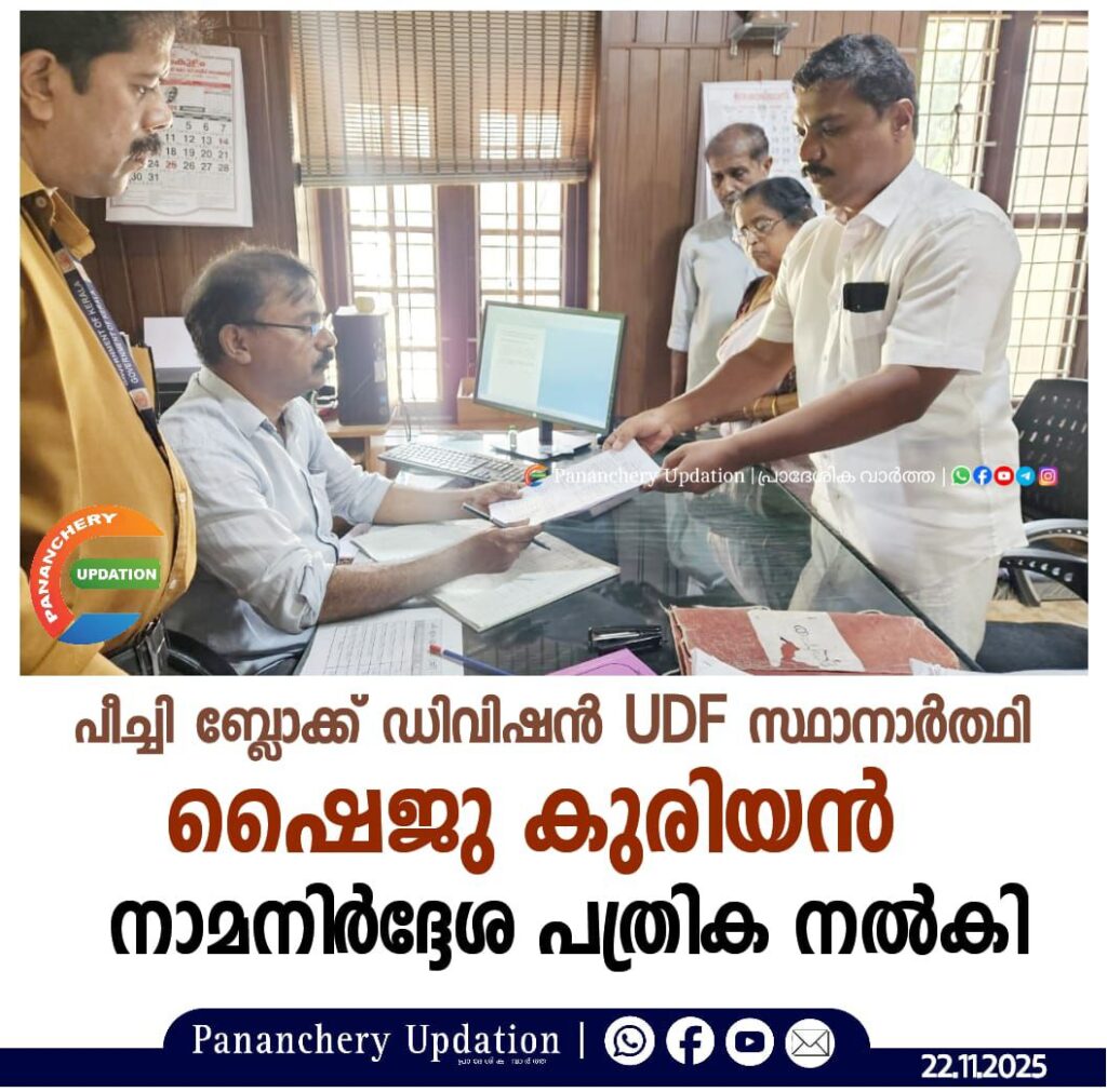 പീച്ചി ബ്ലോക്ക് ഡിവിഷൻ UDF സ്ഥാനാർത്ഥി ഷൈജു കുരിയൻ നാമനിർദ്ദേശ പത്രിക നൽകി