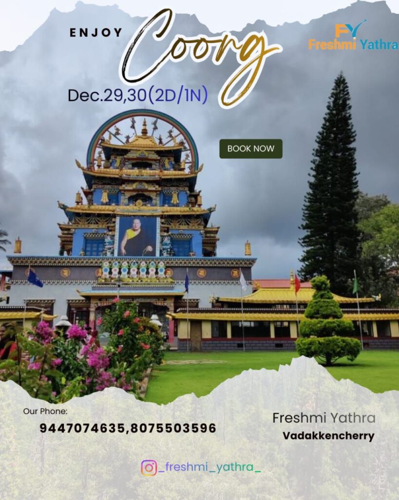 ഇന്ത്യയിലെ സ്കോട്ട്ലൻഡ് എന്നറിയപ്പെടുന്ന കൂർഗിലേക്ക്, ഡിസംബർ 29, 30 തീയതികളിൽ ഫ്രഷ്മി ഒരുക്കുന്ന യാത്രയിൽ നിങ്ങൾക്കും പങ്കുചേരാം…..