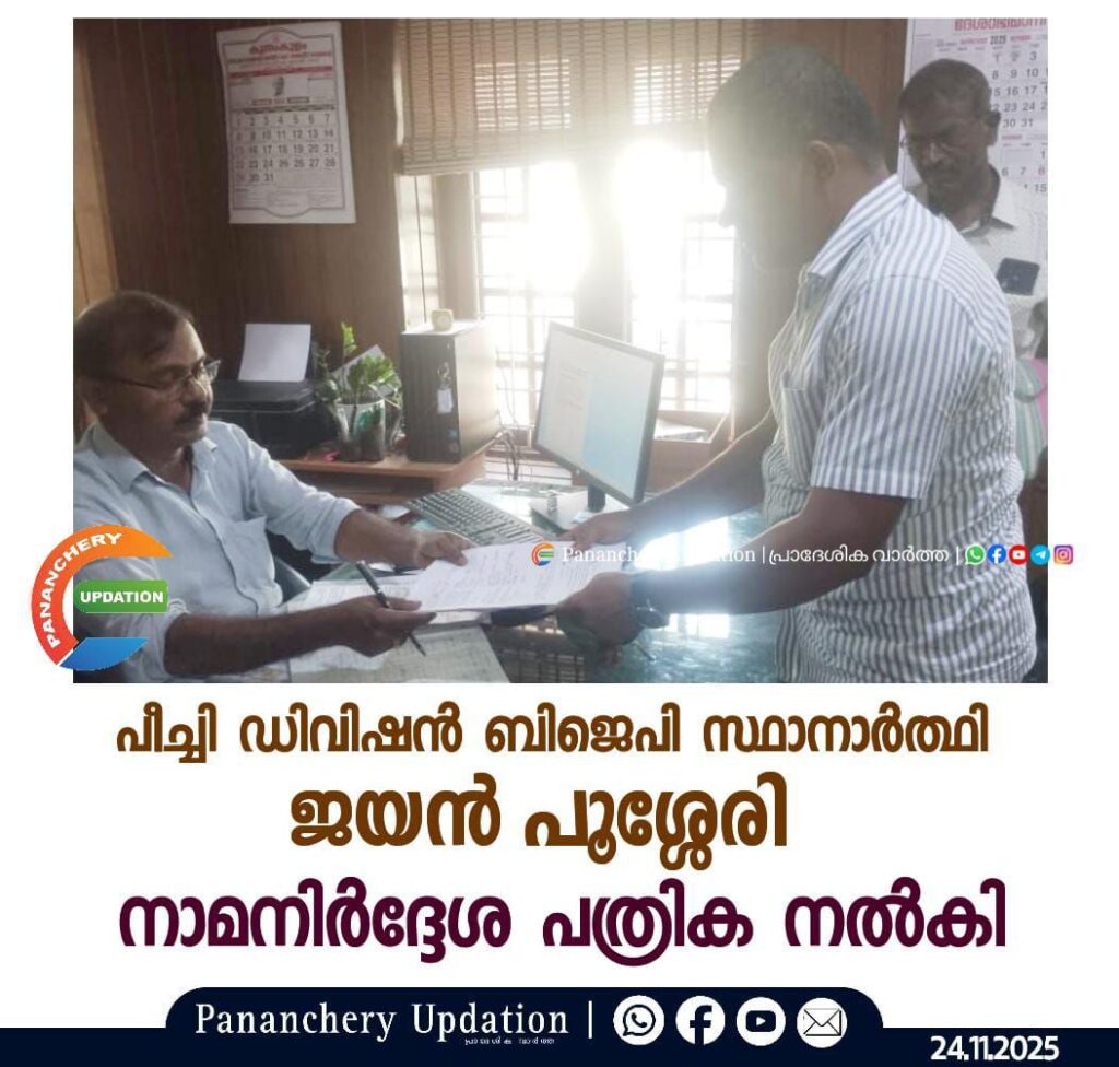 പഞ്ചായത്ത് പീച്ചി ഡിവിഷൻ ബിജെപി സ്ഥാനാർത്ഥി ജയൻ പൂശ്ശേരി നാമനിർദ്ദേശ പത്രിക നൽകി. പാണഞ്ചേരി പഞ്ചായത്ത് ചെമ്പൂത്ര സ്വദേശി ജയൻ പൂശ്ശേരി ഒല്ലുക്കര ബ്ലോക്ക് പഞ്ചായത്ത് സെക്രട്ടറിക്ക് പാർട്ടി നേതാക്കളുടെയും സുഹൃത്തുക്കളുടെയും സാന്നിധ്യത്തിൽ നാമനിർദ്ദേശപത്രിക സമർപ്പിച്ചു