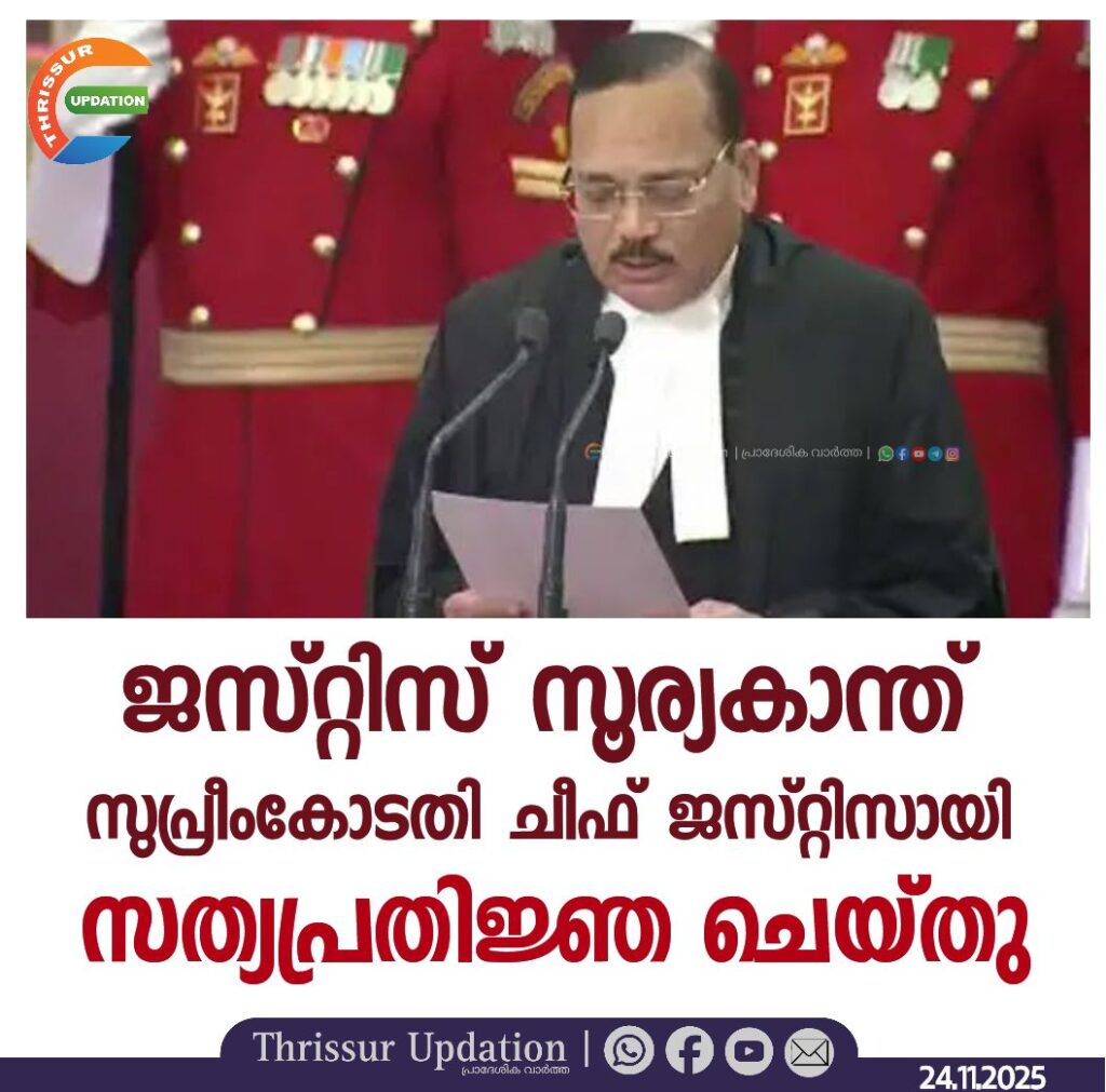 ഇന്ത്യയുടെ 53ാം ചീഫ് ജസ്റ്റിസായി ജസ്റ്റിസ് സൂര്യകാന്ത് സത്യപ്രതിജ്ഞ ചൊല്ലി ചുമതലയേറ്റു. രാഷ്ട്രപത്രി ദ്രൗപതി മുര്മു സത്യവാചകം ചൊല്ലിക്കൊടുത്തു. രാഷ്ട്രപതി ഭവനിലാണ് ചടങ്ങുകള്. പ്രധാനമന്ത്രി നരേന്ദ്രമോദി, ആഭ്യന്തര മന്ത്രി അമിത് ഷാ, പ്രതിരോധ മന്ത്രി രാജ് നാഥ് സിംഗ് ഉള്പ്പെടെയുള്ളവര് ചടങ്ങില് പങ്കെടുത്തു.ജമ്മുകശ്മീരിന് പ്രത്യേക പദവി നല്കുന്ന ആര്ട്ടിക്കിള് 370 റദ്ദാക്കല്, പെഗാസസ് ചാരക്കേസ്, ബീഹാര് വോട്ടര് പട്ടിക പരിഷ്കരണം അടക്കം സുപ്രധാന വിധികള് നടത്തിയ ജസ്റ്റിസ് ആണ് സൂര്യകാന്ത്. പ്രധാനമന്ത്രി നരേന്ദ്ര മോദിയുടെ 2022-ലെ പഞ്ചാബ് സന്ദര്ശനത്തിനിടെയുണ്ടായ സുരക്ഷാ വീഴ്ച അന്വേഷിക്കാന് മുന് സുപ്രീം കോടതി ജഡ്ജി ജസ്റ്റിസ് ഇന്ദു മല്ഹോത്രയുടെ നേതൃത്വത്തില് അഞ്ചംഗ സമിതിയെ നിയോഗിച്ച ബെഞ്ചില് ജസ്റ്റിസ് കാന്തും അംഗമായിരുന്നു.
