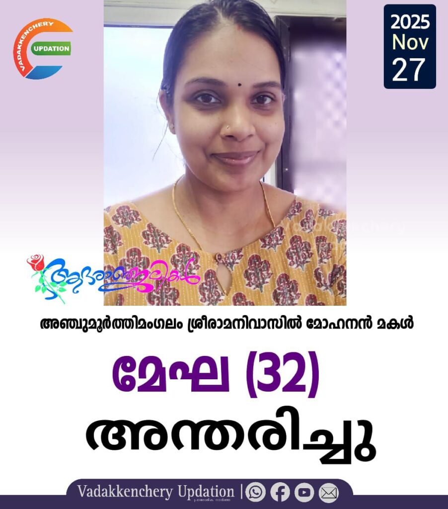 അഞ്ചുമൂർത്തിമംഗലം ശ്രീരാമനിവാസിൽ മേഘ (32) അന്തരിച്ചു. അച്ഛൻ: മോഹനൻ (rtd. Si) അമ്മ: ബേബി, സഹോദരങ്ങൾ: മനുപ്രസദ്. (Airforce) ഭർത്താവ്: അരുൺ(ടെക്നോ പാർക്ക് തിരുവനന്തപുരം )മക്കൾ. അക്ഷര, അതിഥി, സംസ്ക്കാരം പിന്നീട്