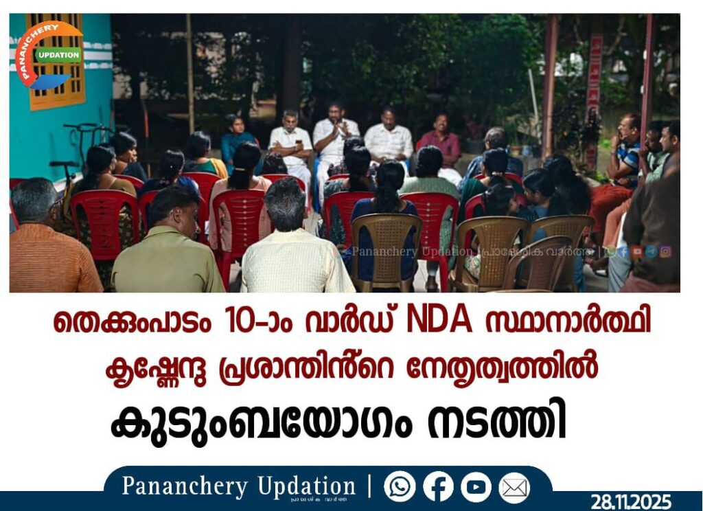തെക്കുംപാടം 10ാം വാർഡ് NDA സ്ഥാനാർത്ഥി കൃഷ്ണേന്ദു പ്രശാന്തിൻ്റെ കുടുംബയോഗങ്ങൾ സംഘടിപ്പിക്കുന്നു. രാജേന്ദ്രൻ മണപറമ്പിലിൻ്റെ വീട്ടിൽ നടത്തിയ കുടുംബയോഗം BJP ജില്ലാ മെമ്പർ P.P. ജോണി ഉദ്ഘാടനം ചെയ്തു. വാർഡ് സംയോജകൻ NSപീതാംബരൻ അദ്ധ്യക്ഷത വഹിച്ചു ബൂത്ത് പ്രസിഡൻ്റ് ബിജു കൊല്ലമറ്റം സ്വാഗതവും വിജയൻ കമ്പിളി നന്ദിയും പറഞ്ഞു. BDJS പഞ്ചായത്ത് പ്രസിഡൻ്റ് പ്രബിഷ് കോർഡിനേറ്റർ ജയൻ കണ്ടംപ്പുള്ളി എന്നിവർ സംസാരിച്ചു, കൃഷ്ണേന്ദുവിൻ്റെ വിജയം ഉറപ്പായെന്ന് യോഗം വിലയിരുത്തി യോഗത്തിൽ ധാരാളം ആളുകൾ പങ്കെടുത്തു.