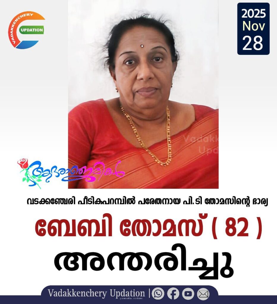 പി.ടി തോമസിന്റെ ഭാര്യ ബേബി തോമസ് ( 82 )അന്തരിച്ചു. പരേത കോട്ടയം പുളിക്കമറ്റത്തിൽ കുടുംബാഗം ആണ്. ശനിയാഴ്ച 29.11.2025ന് വൈകുന്നേരം 6 മണിയോടുകൂടി വടക്കഞ്ചേരി പീടികപറമ്പിൽ ഭവനത്തിൽ ഭൗതികശരീരം എത്തുന്നതാണ്. സംസ്ക്കാരം 30.11.25 ഞായറാഴ്ച ഉച്ചക്ക് മൂന്നര മണിക്ക് ഭവനത്തിലെ ശുശ്രൂഷകൾക്ക് ശേഷം തേനിടുക്ക് സെൻ്റ് ജോർജ്ജ് യാക്കോബായ സുറിയാനി പള്ളിയിൽ. മക്കൾ: പരേതനായ സുനിൽ തോമസ്, ജോതി തോമസ്, അമ്പിളി ജോസ്. മരുമക്കൾ: Dr ജോസ് പി അഗസ്റ്റിൻ പുതുവ, ഹണി സുനിൽ അക്കരപറ്റി,ശീതൾ ജോതി കറുകപ്പറമ്പിൽ.